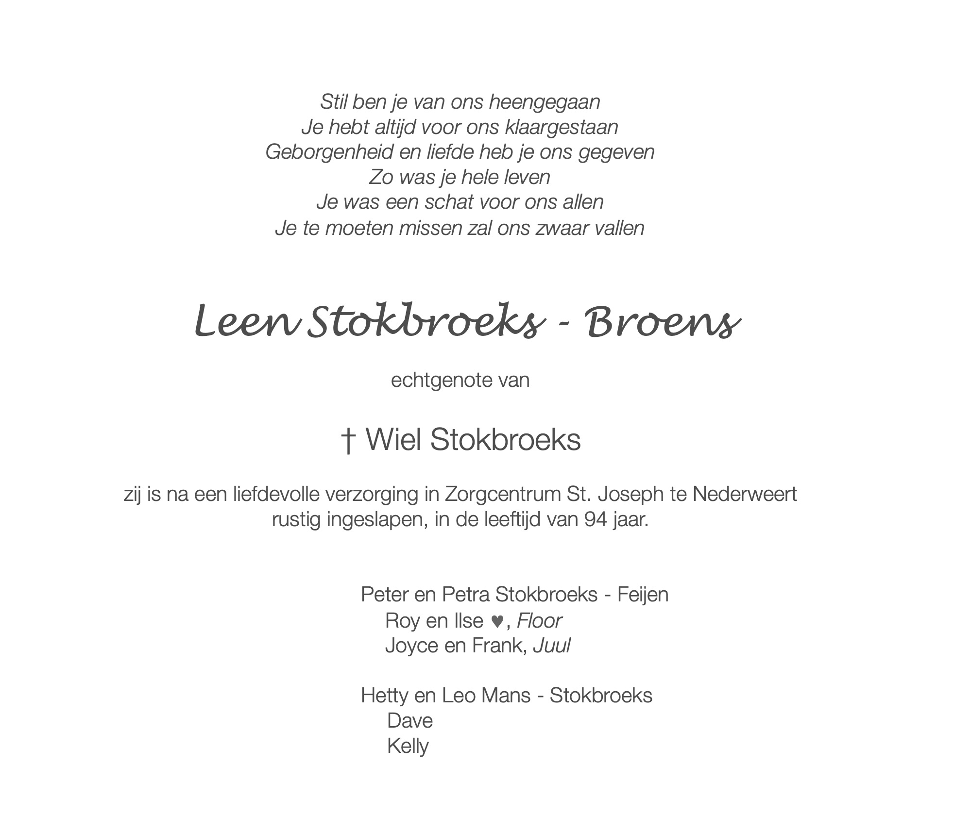 Familie Stokbroeks van harte gecondoleerd.