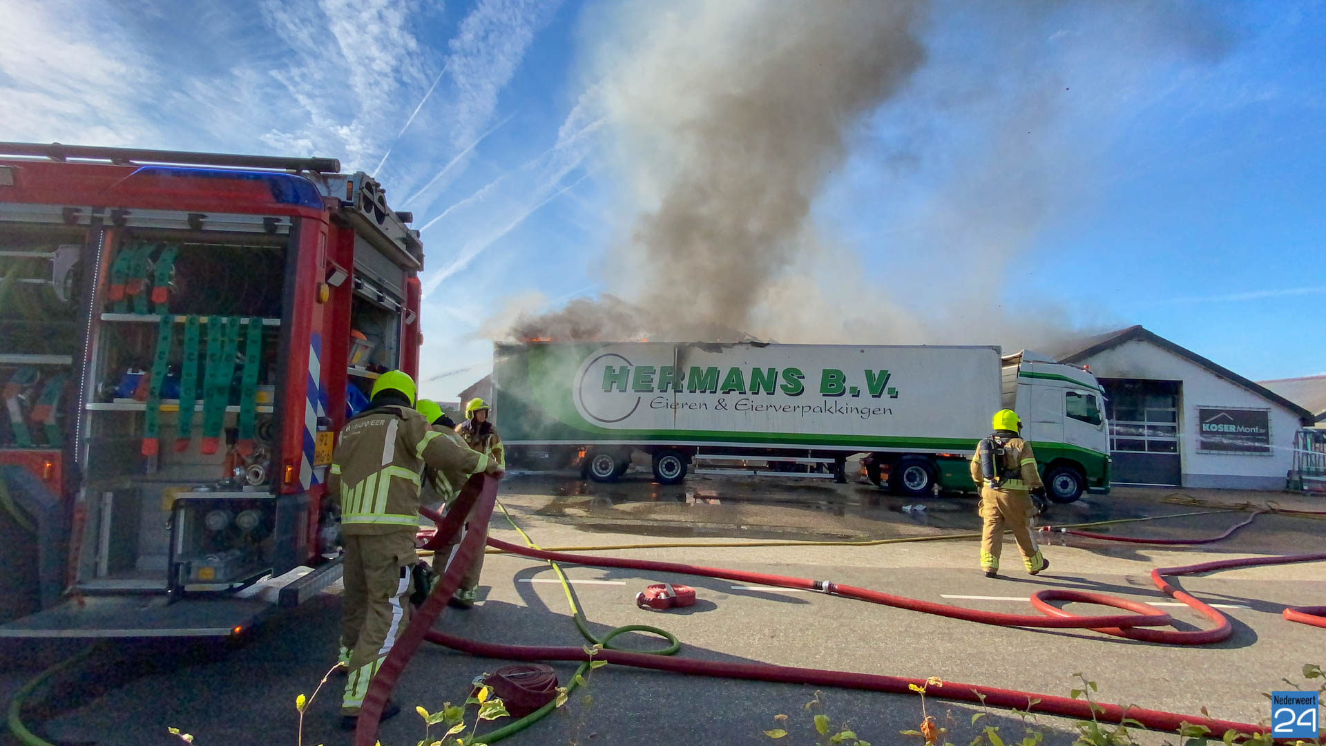 De brand is uitgebroken in een loods. Voor de loods stond een vrachtwagen die ook vlam heeft gevat. Bij de brand zijn in totaal twee loodsen uitgebrand. In één loods stond verpakkingsmateriaal voor eieren en pallets. In de andere loods zat een bedrijf wat doet in kunststof kozijnen en rolluiken. De brandweer heeft weten te voorkomen dat de aangrenzende loods en de twee naastgelegen woningen gespaard bleven. Rond de klok van 21.00 uur is het sein brand meester gegeven.