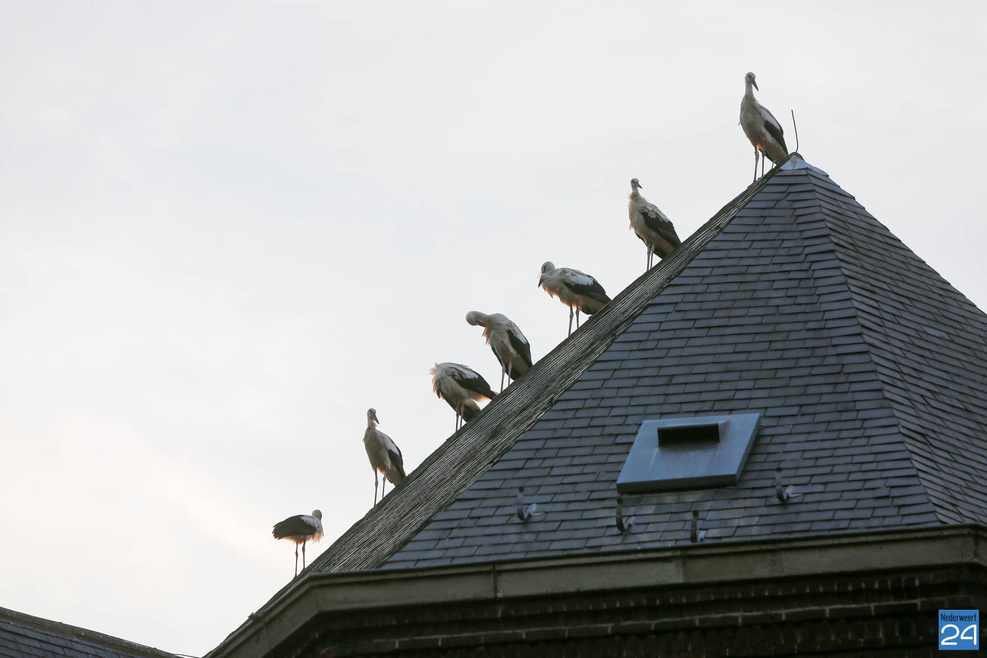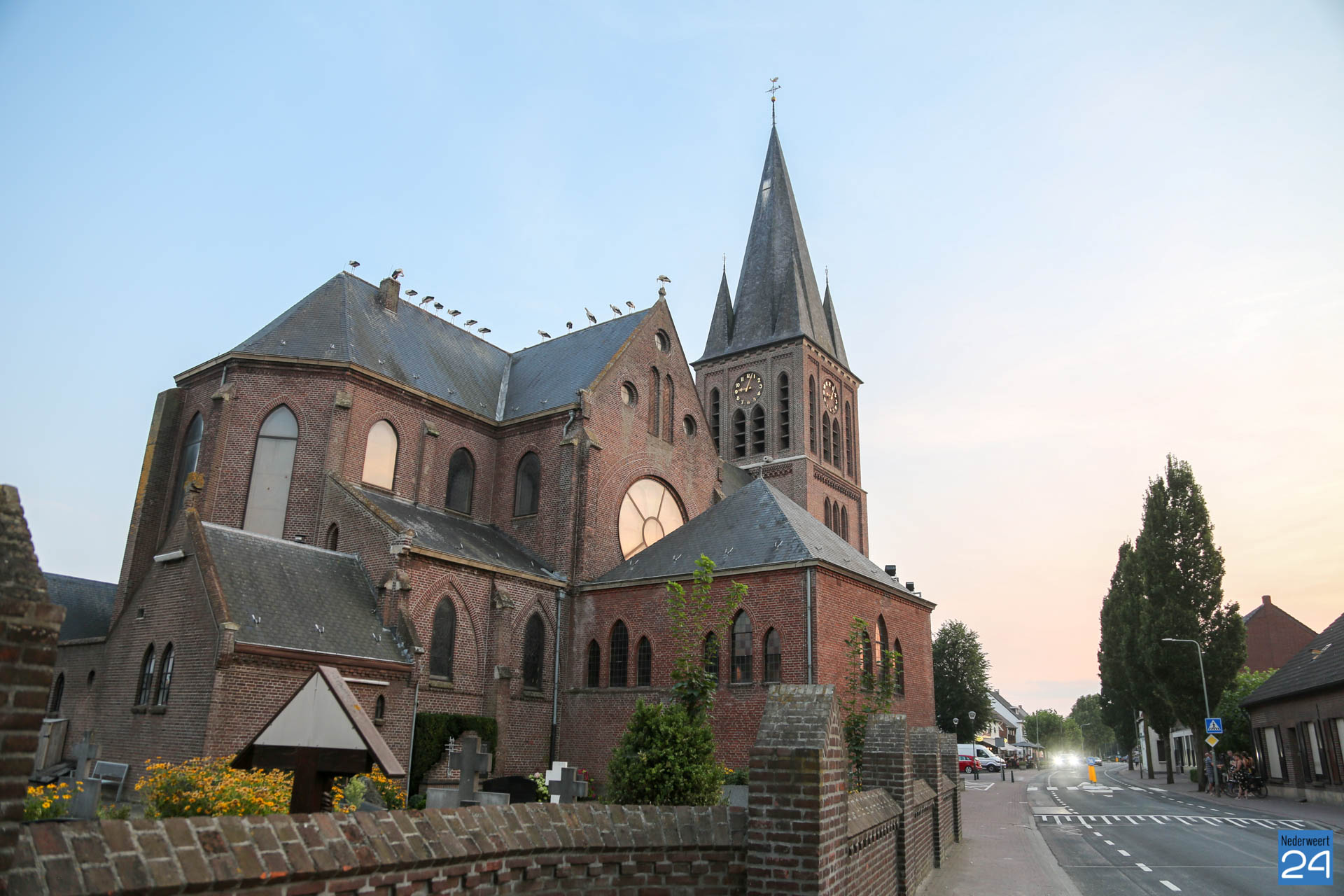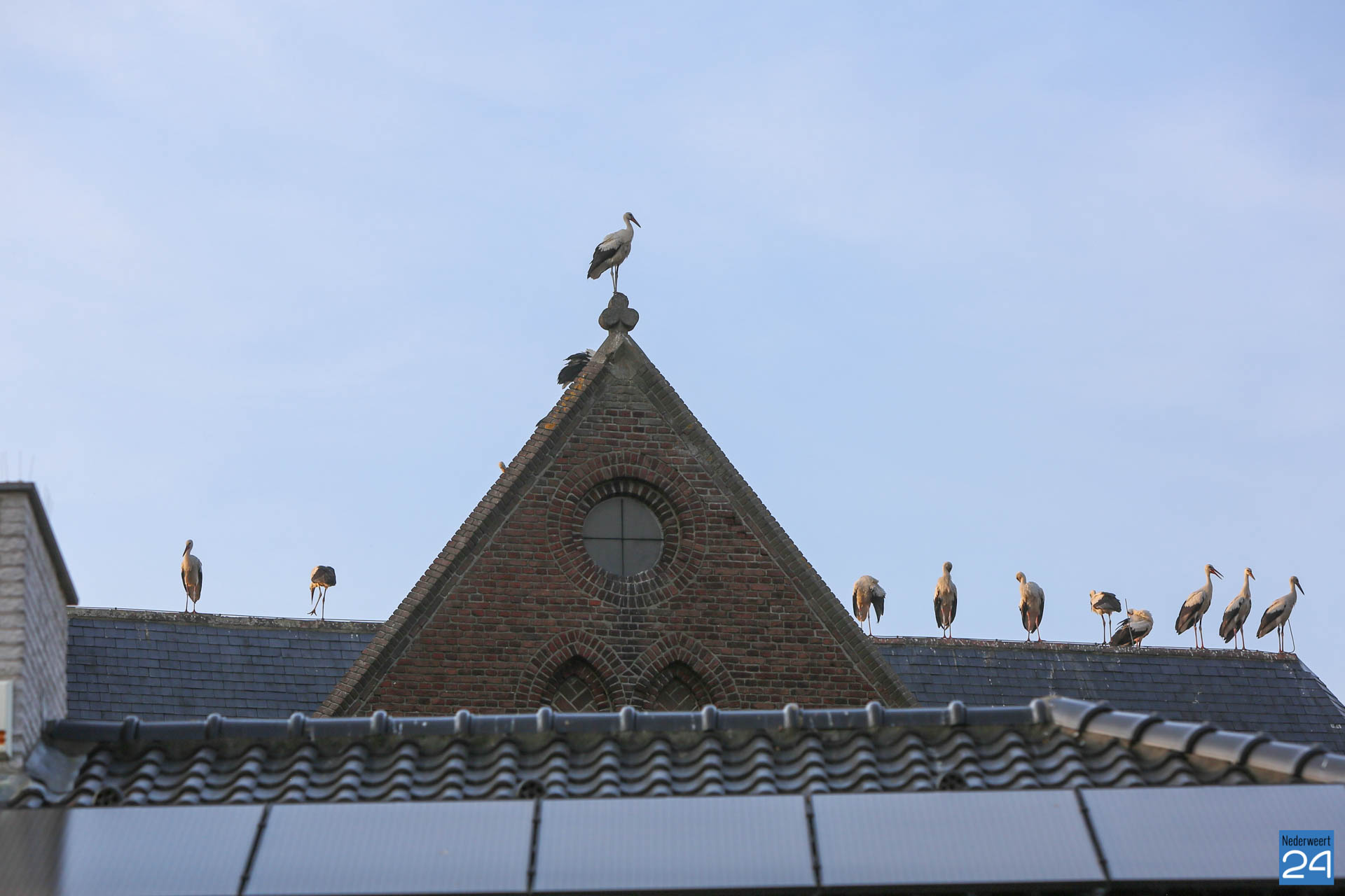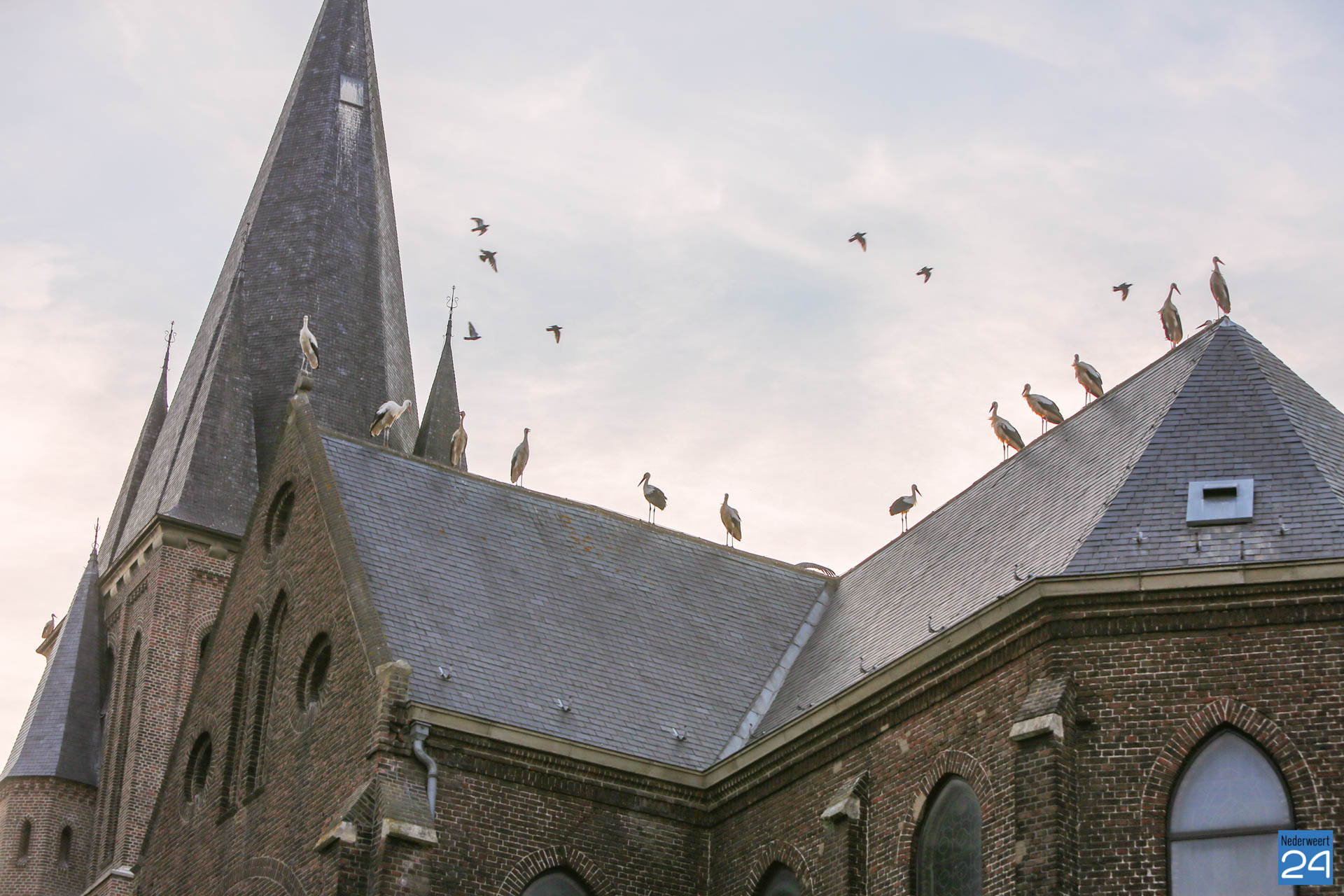 Het was zondagavond druk in het centrum van Ospel. Tientallen ooievaars streken neer in het dorp voor een overnachting op de kerk en op lichtmasten bij RKSVO en TC Meulenslag.