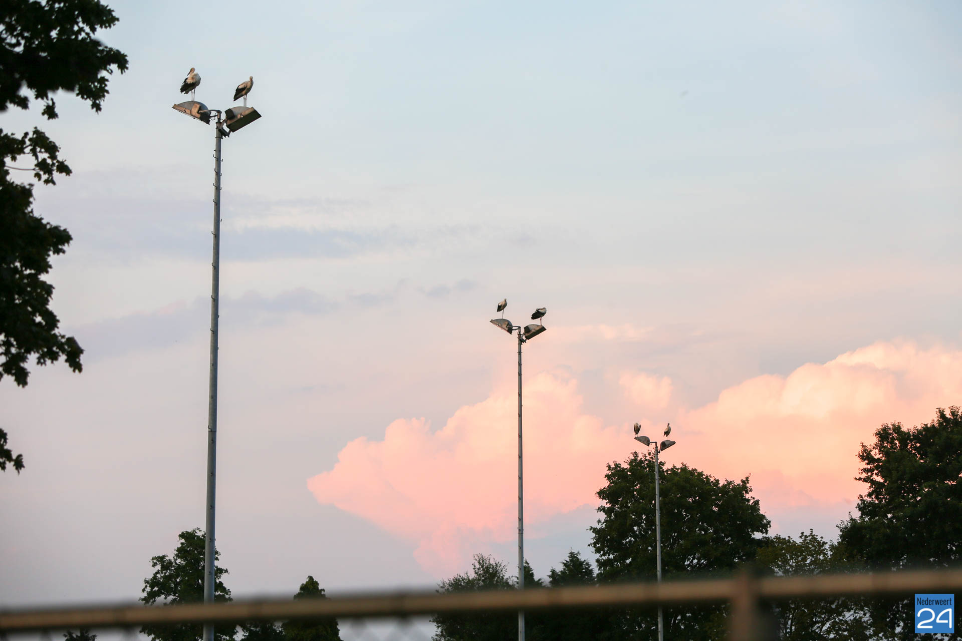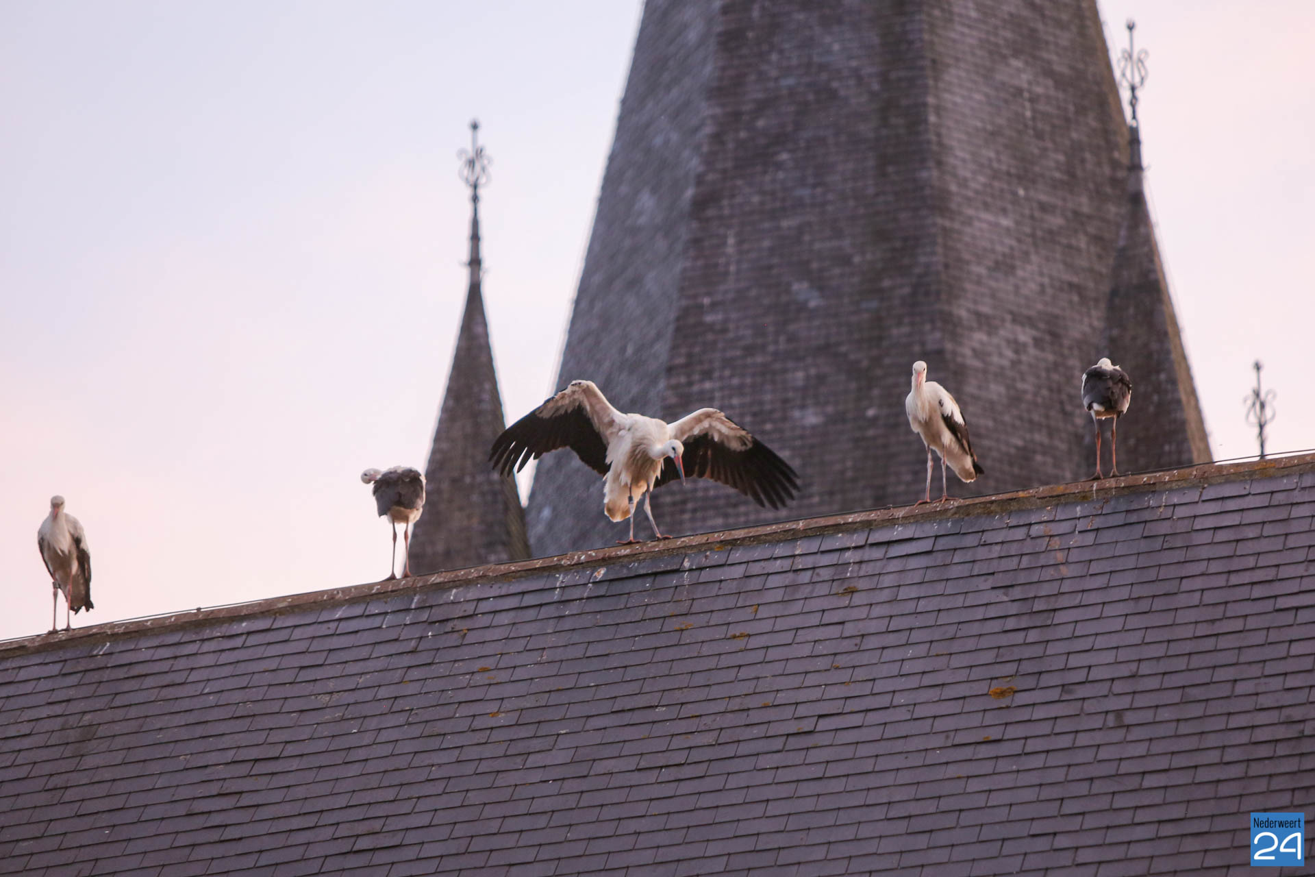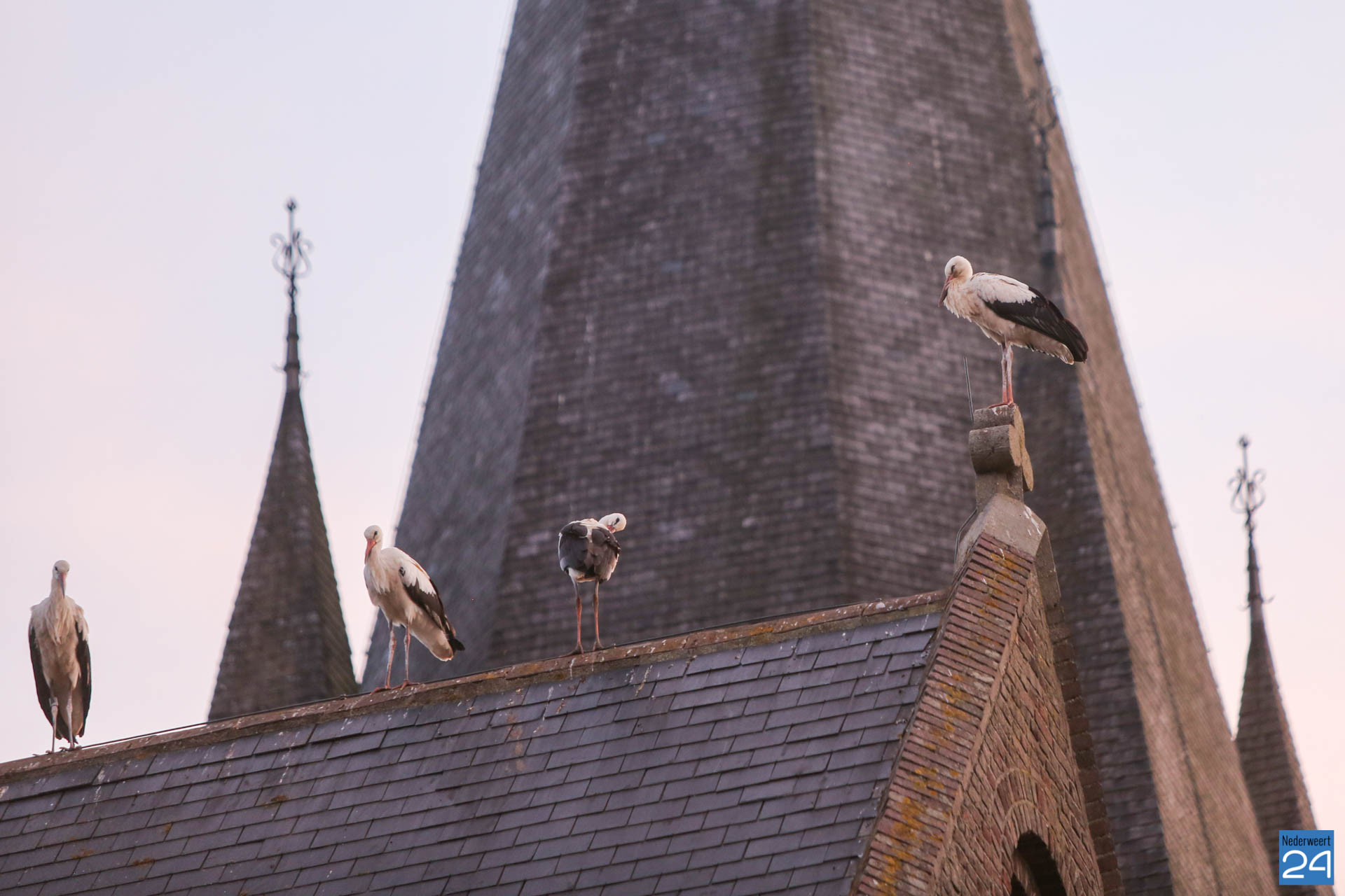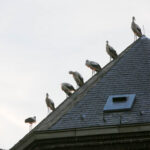 Het was zondagavond druk in het centrum van Ospel. Tientallen ooievaars streken neer in het dorp voor een overnachting op de kerk en op lichtmasten bij RKSVO en TC Meulenslag.