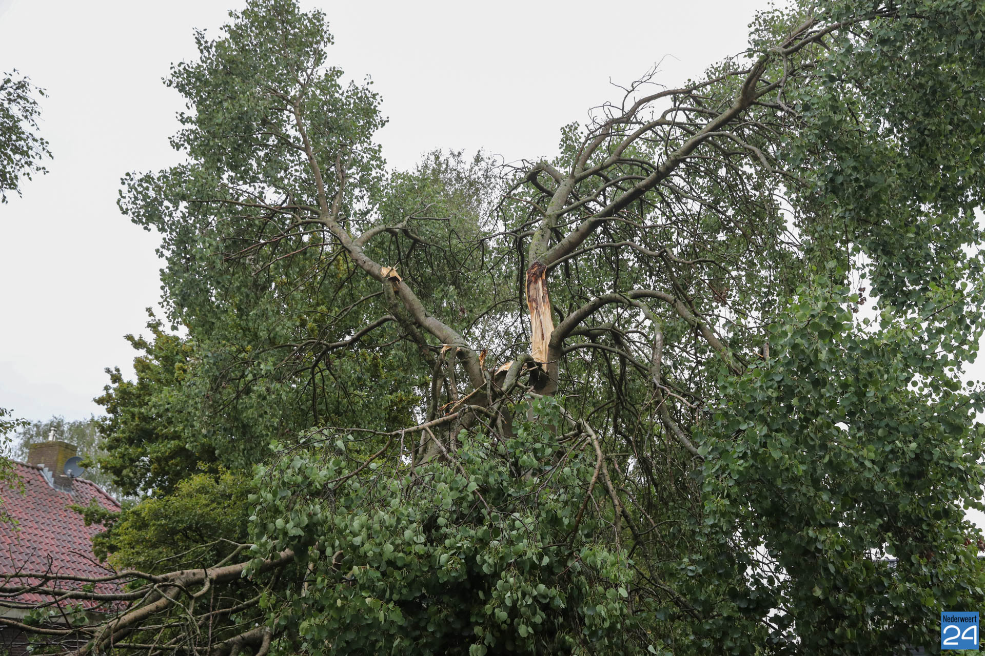 Dinsdagavond is een flinke tak afgebroken van een boom aan de Schinkelsweg in Ospel. Het is niet helemaal duidelijk of de wind of een blikseminslag de oorzaak is.