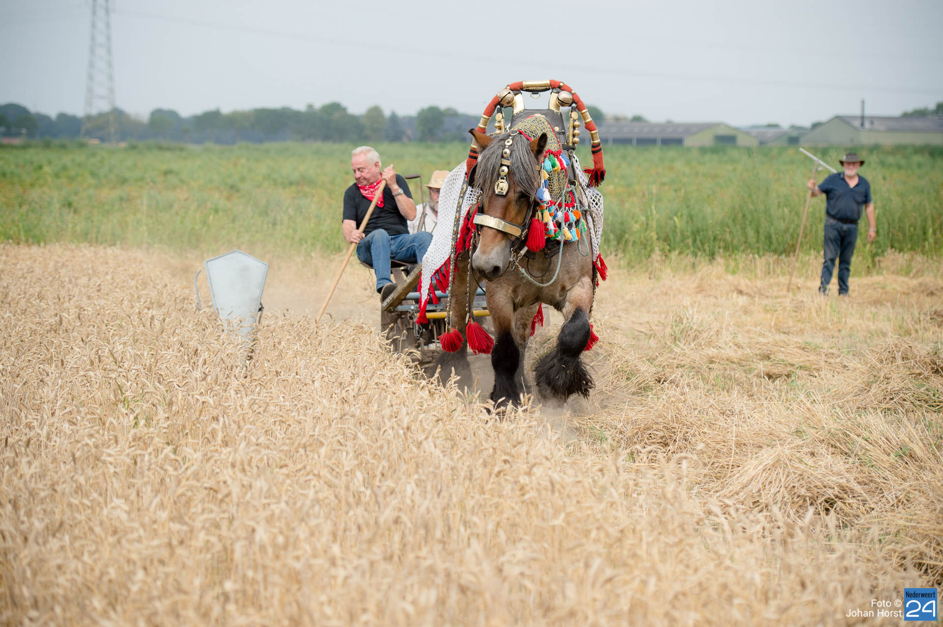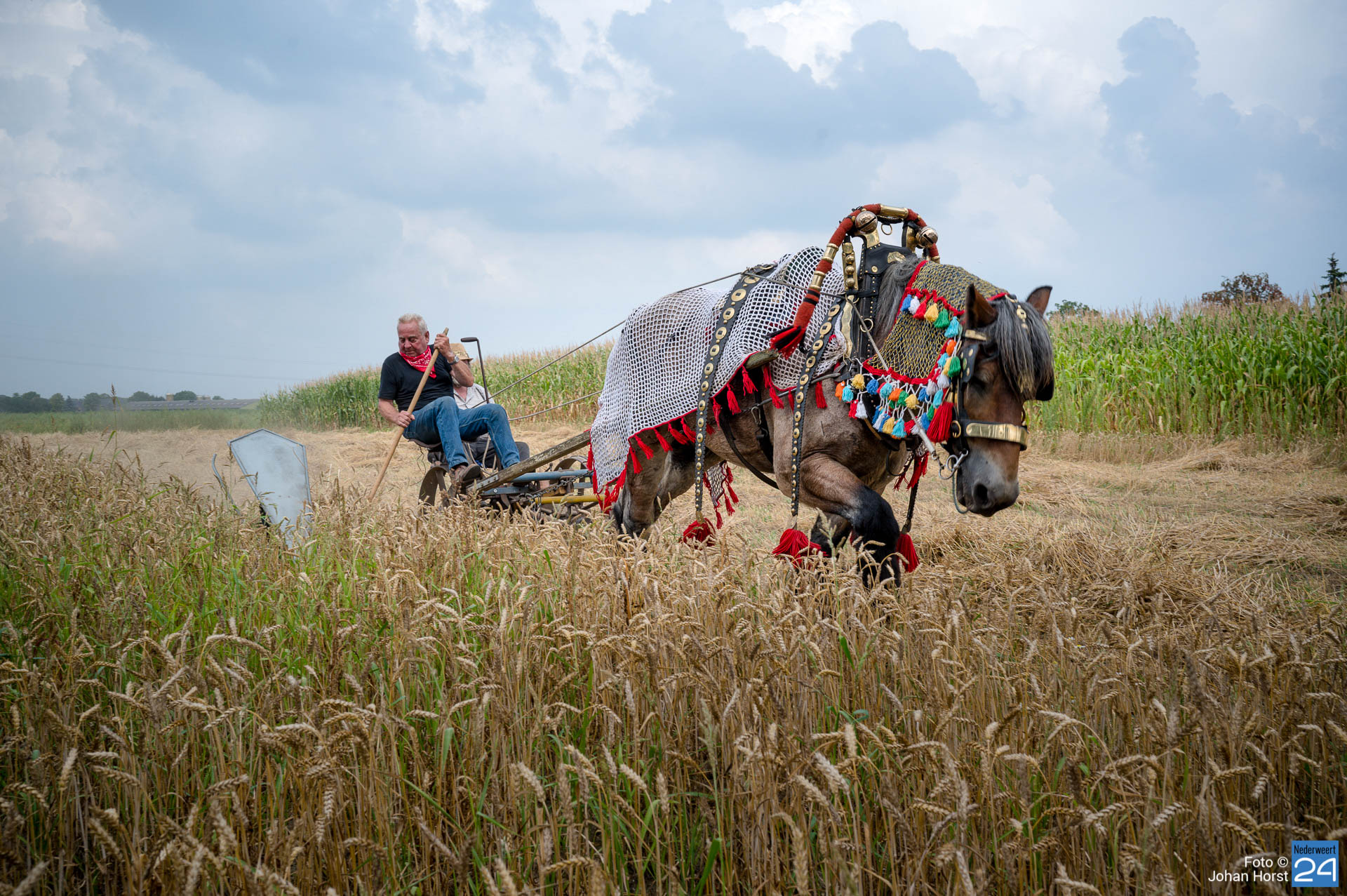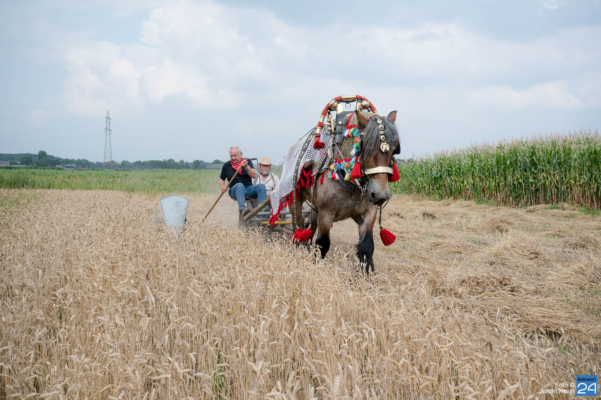 Aan het Roeven in Nederweert was de tarwe rijp om te maaien en dus werd het paard van stal gehaald om die klus te helpen klaren. Dat kan in deze tijden zeker rekenen op publieke belangstelling. Voor het paard moet je natuurlijk goed zorgen en hem ook op tijd verwennen.