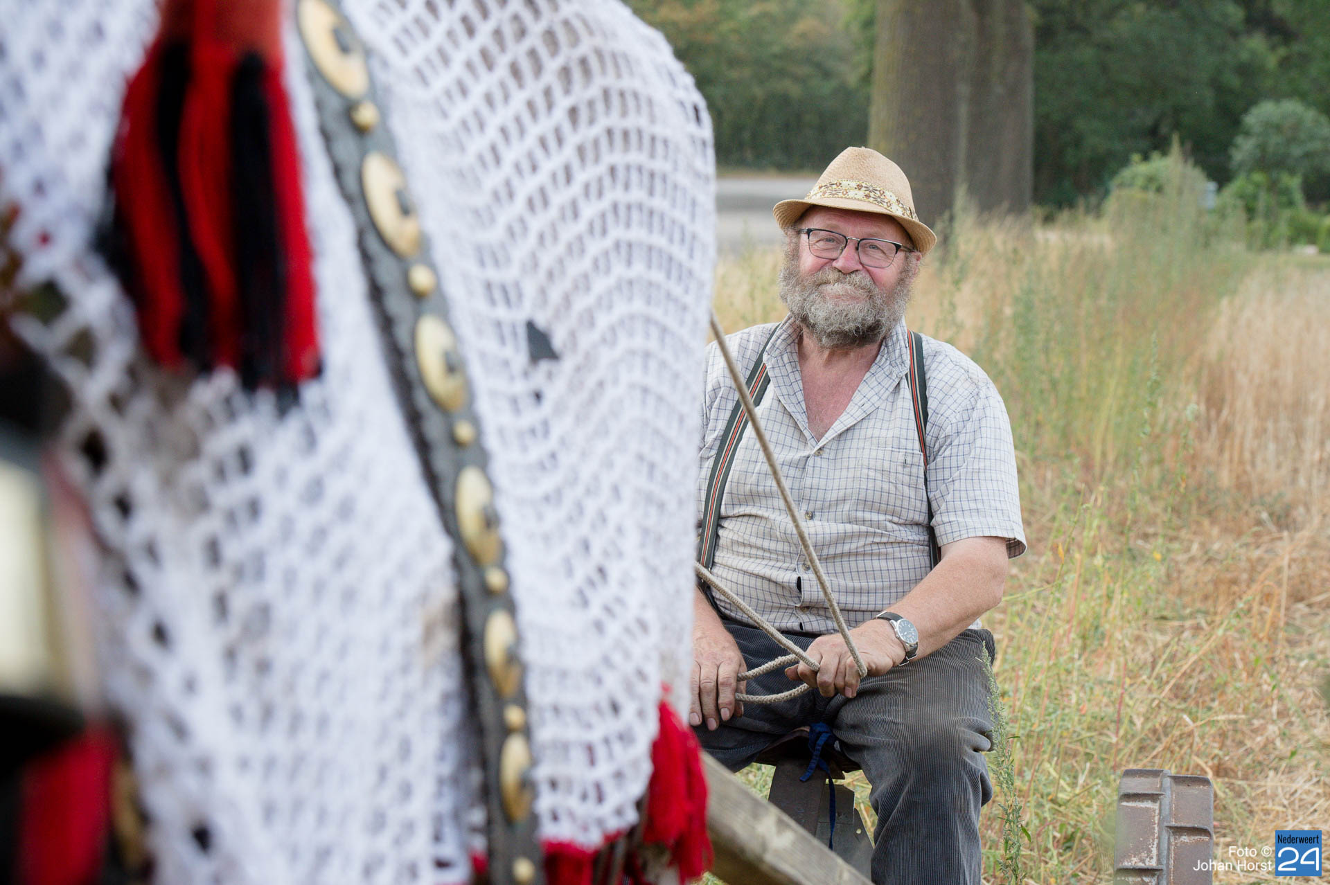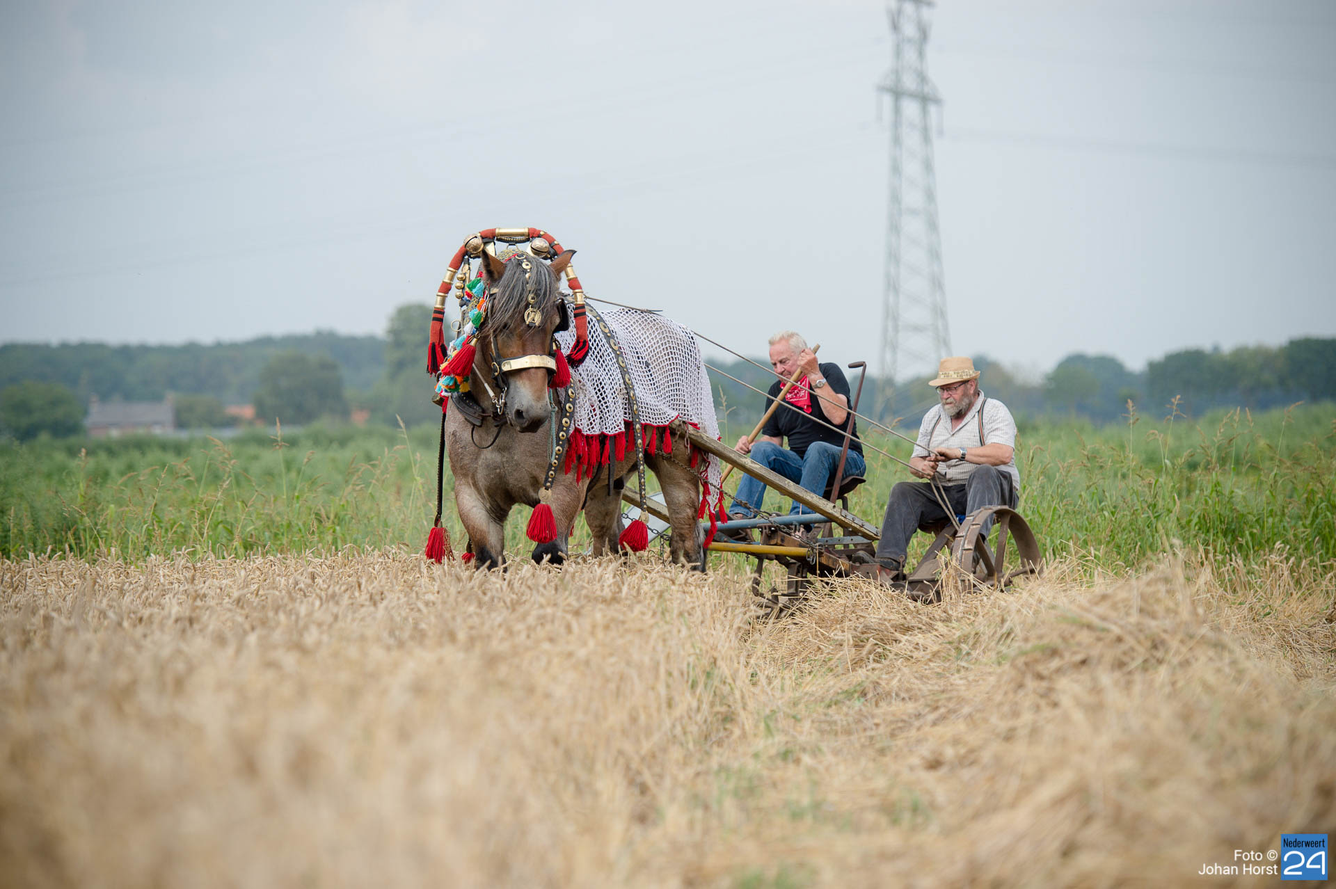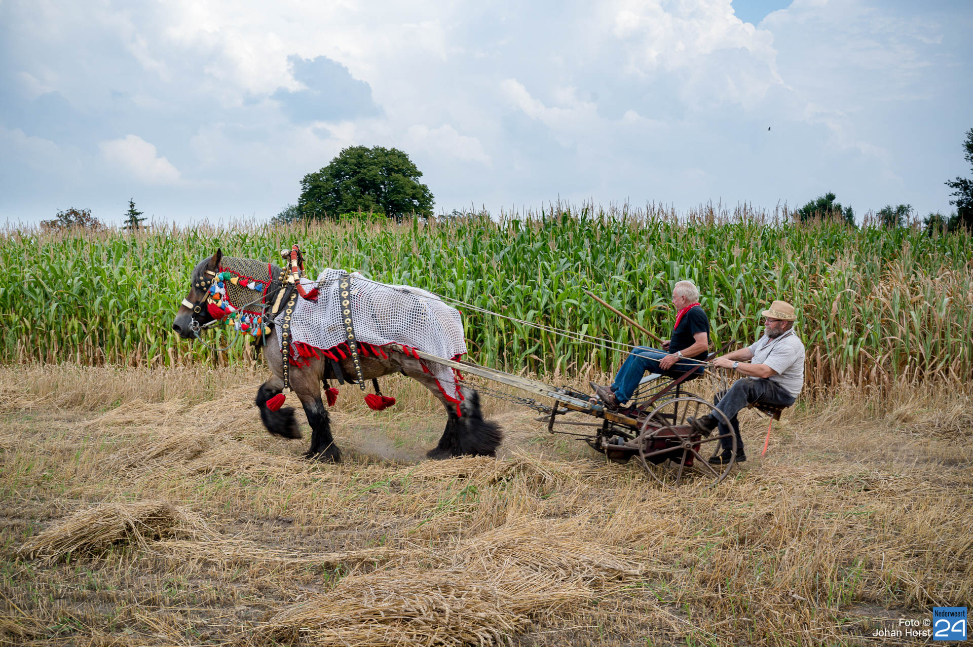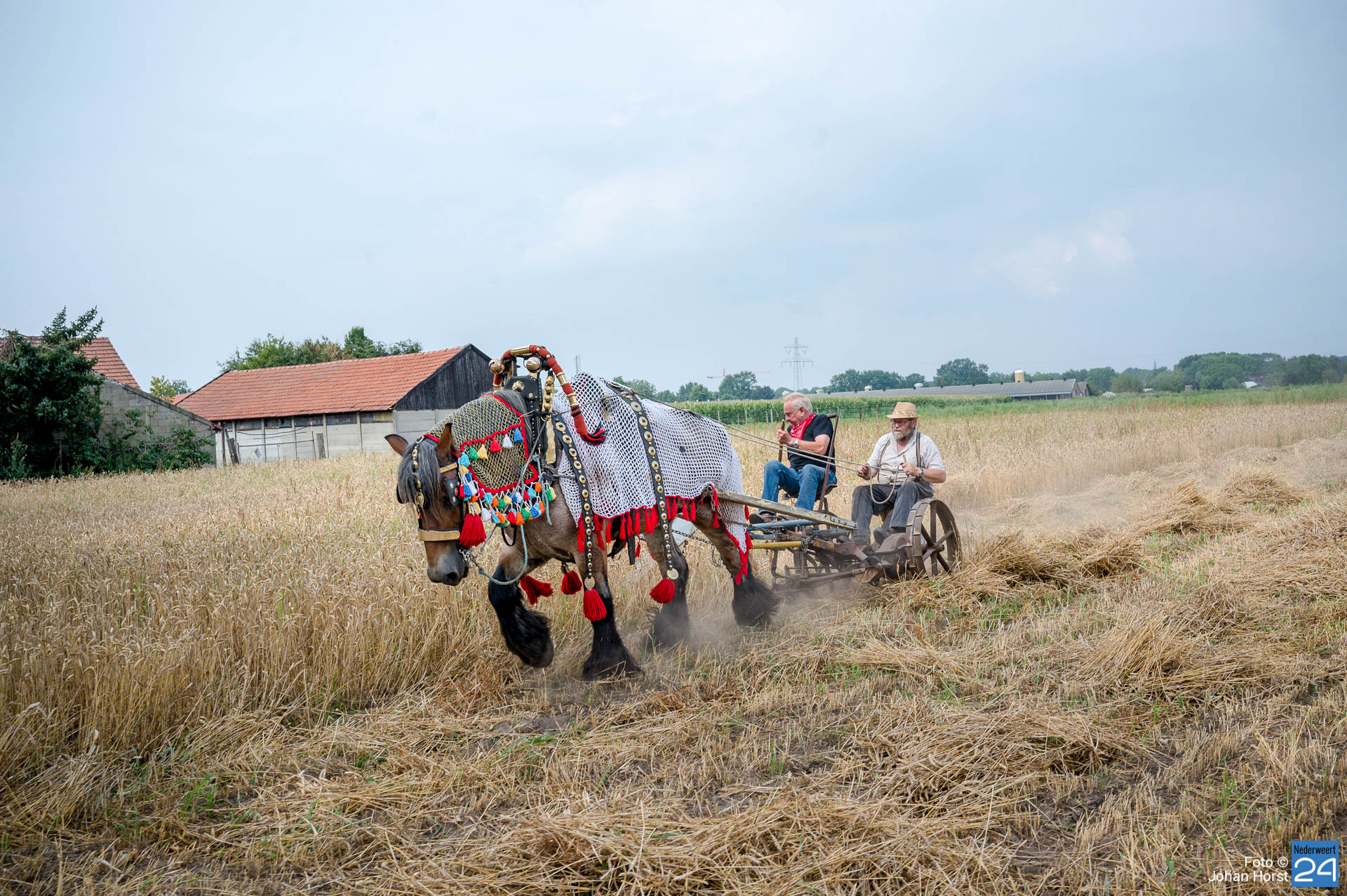 Aan het Roeven in Nederweert was de tarwe rijp om te maaien en dus werd het paard van stal gehaald om die klus te helpen klaren. Dat kan in deze tijden zeker rekenen op publieke belangstelling. Voor het paard moet je natuurlijk goed zorgen en hem ook op tijd verwennen.