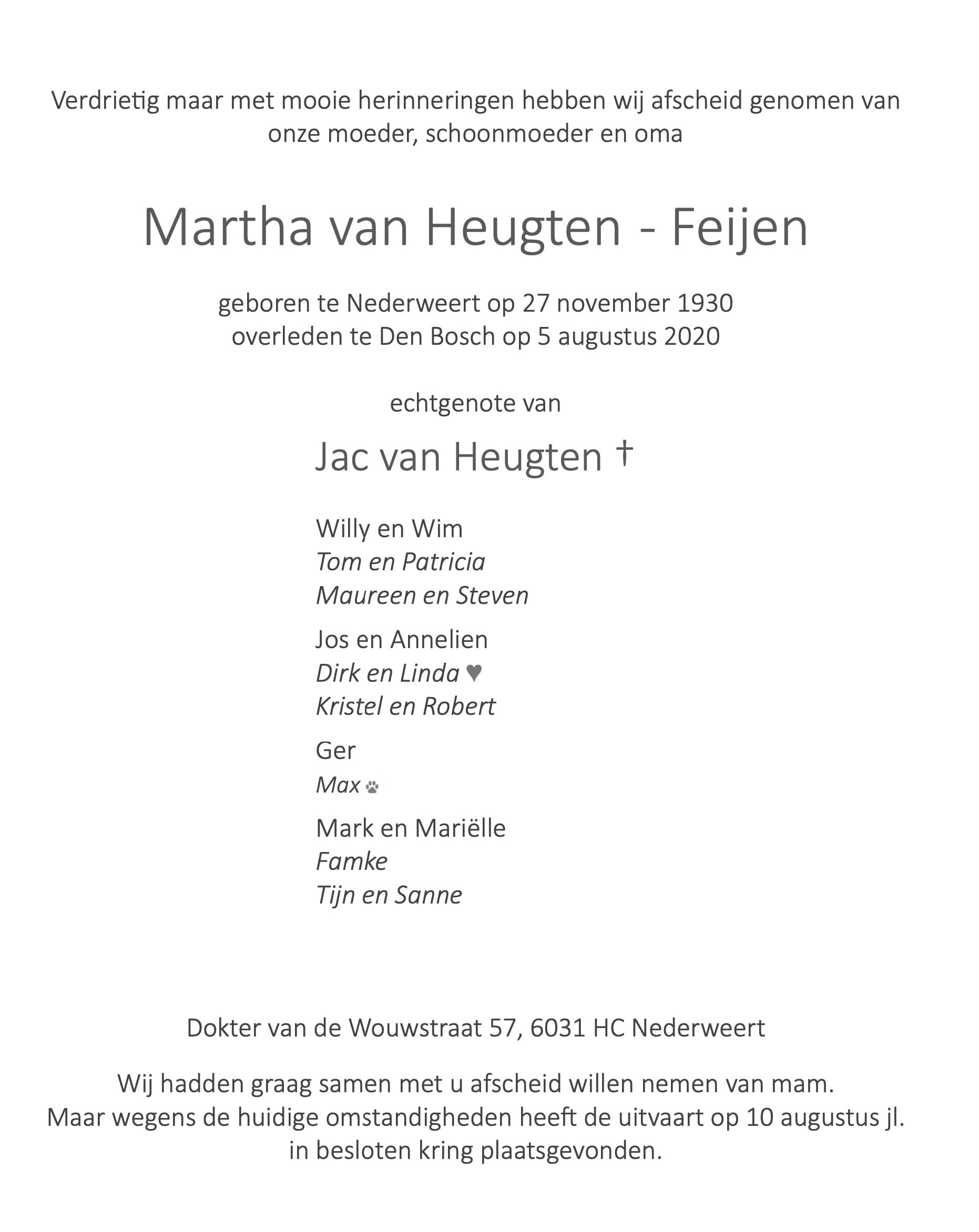 Gecondoleerd met het overlijden van jullie moeder, schoonmoeder en oma. Dat de mooie herinneringen jullie tot steun mogen zijn.