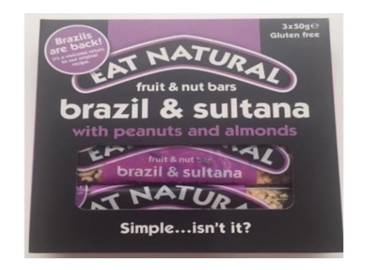 Hand2mouth Ltd heeft besloten om Eat Natural Brazil & sultana with peanuts and almonds 50 gram bar 50676262, 3x 50 gram Multi-pack 5013803001315 en 12x 50 gram Counter pack 50138803621247 met alle houdbaarheidsdata per direct uit de winkelschappen te halen vanwege de mogelijke aanwezigheid van salmonella, afkomstig van een van de ingrediënten, geleverd door een toeleverancier.