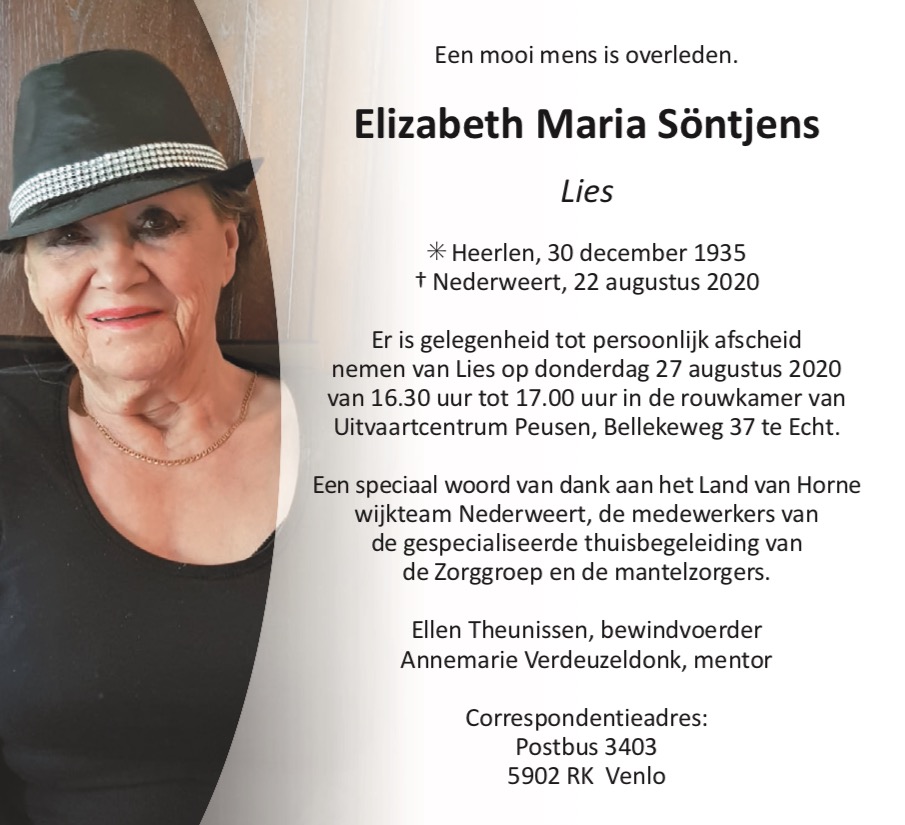 Overlijdensbericht: Elizabeth Maria Söntjens