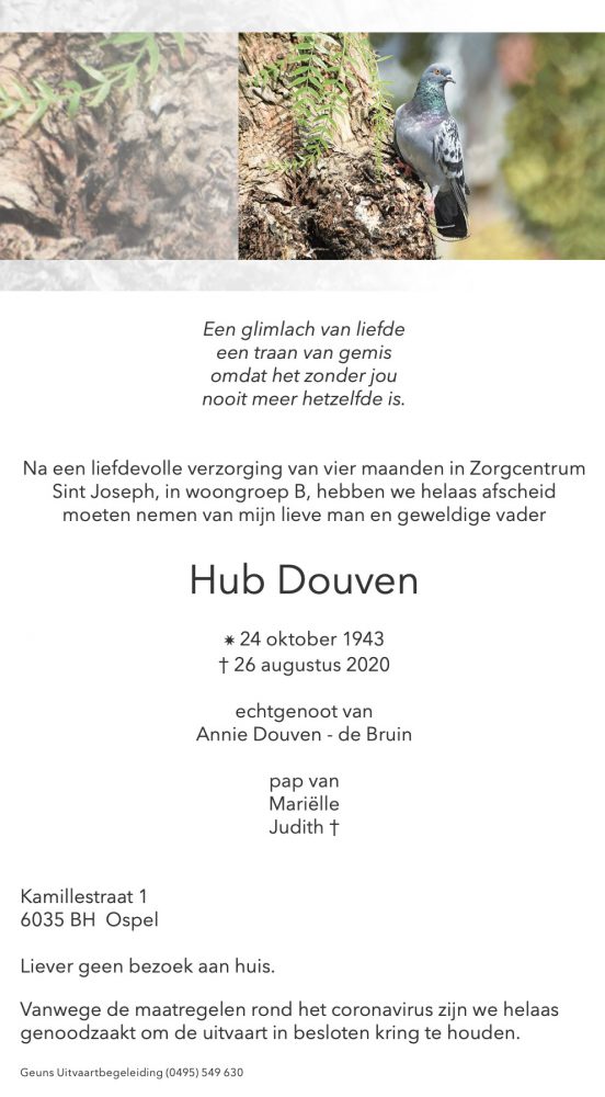 Gecondoleerd met het overlijden van Hub. Heel veel sterkte samen. Toos Kneepkens