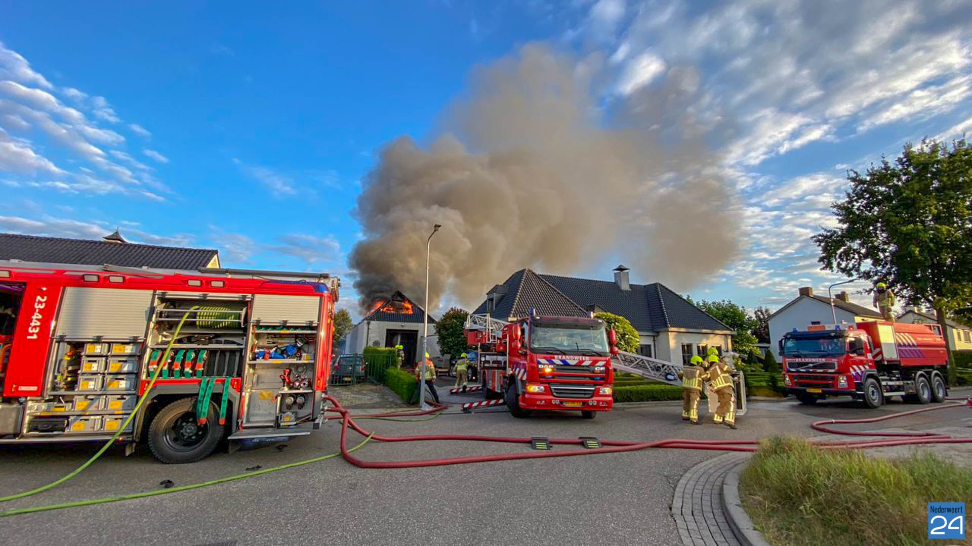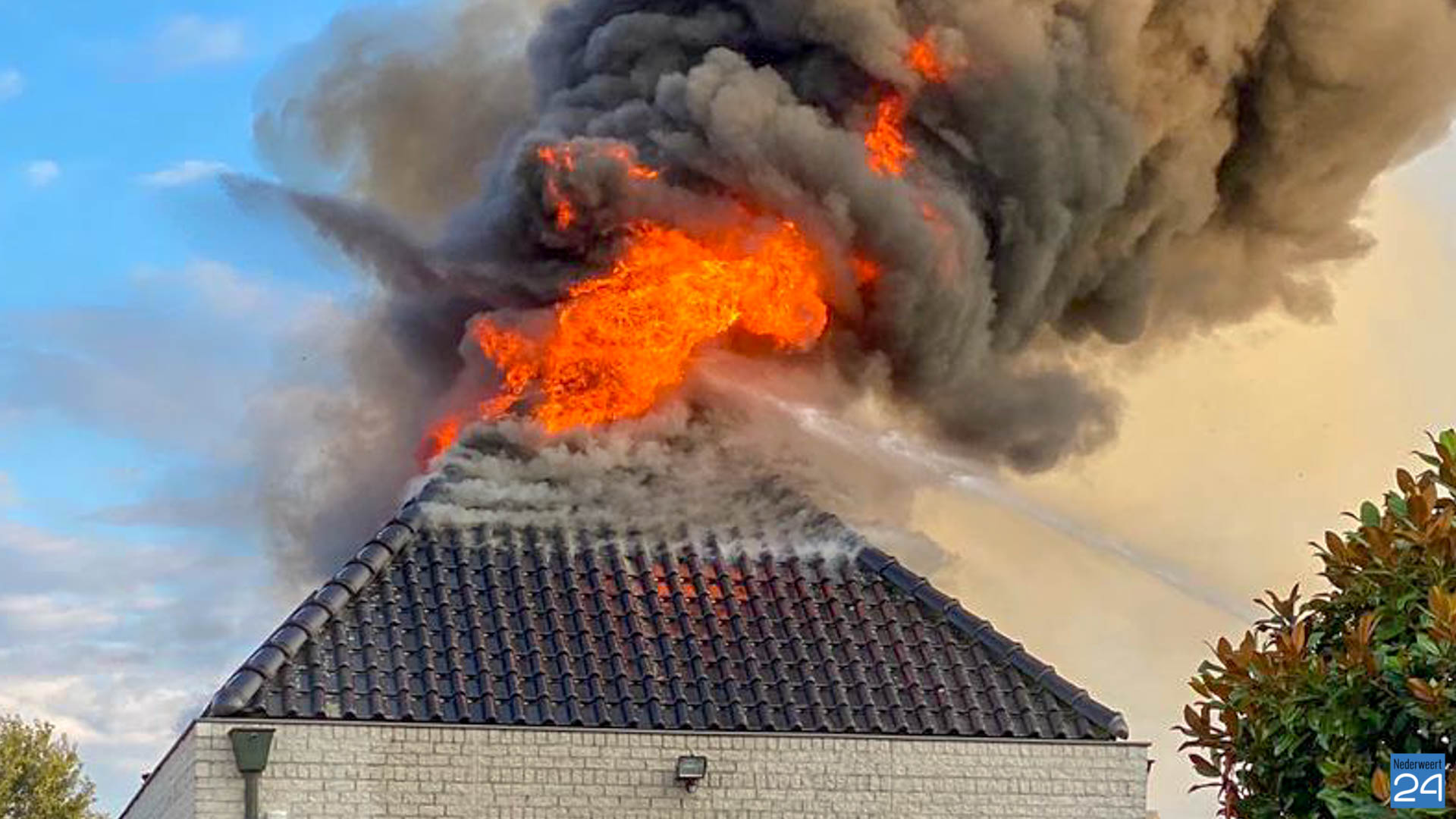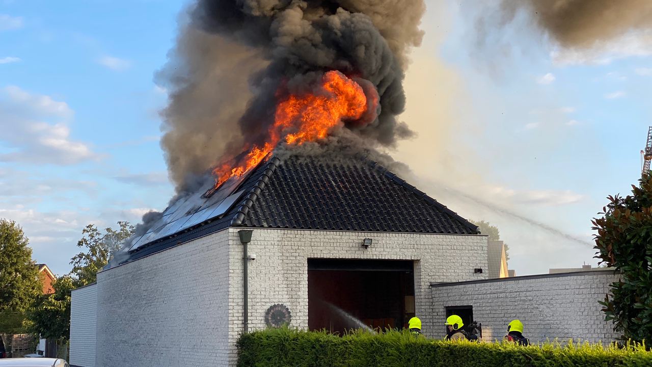 Het gebouw staat los van de woning en de brandweer zet vooral in om overslag naar de woning te voorkomen. De brand gaat gepaard met een flinke rookontwikkeling. Volgens een woordvoerder van de brandweer is een elektrische storing de oorzaak van de brand. Het dak wordt met een kraan verwijderd om het pand verder veilig te kunnen afblussen.