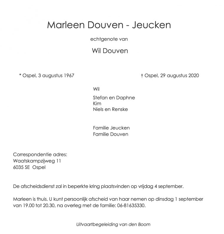 Overlijdensbericht: Marleen Douven – Jeucken †