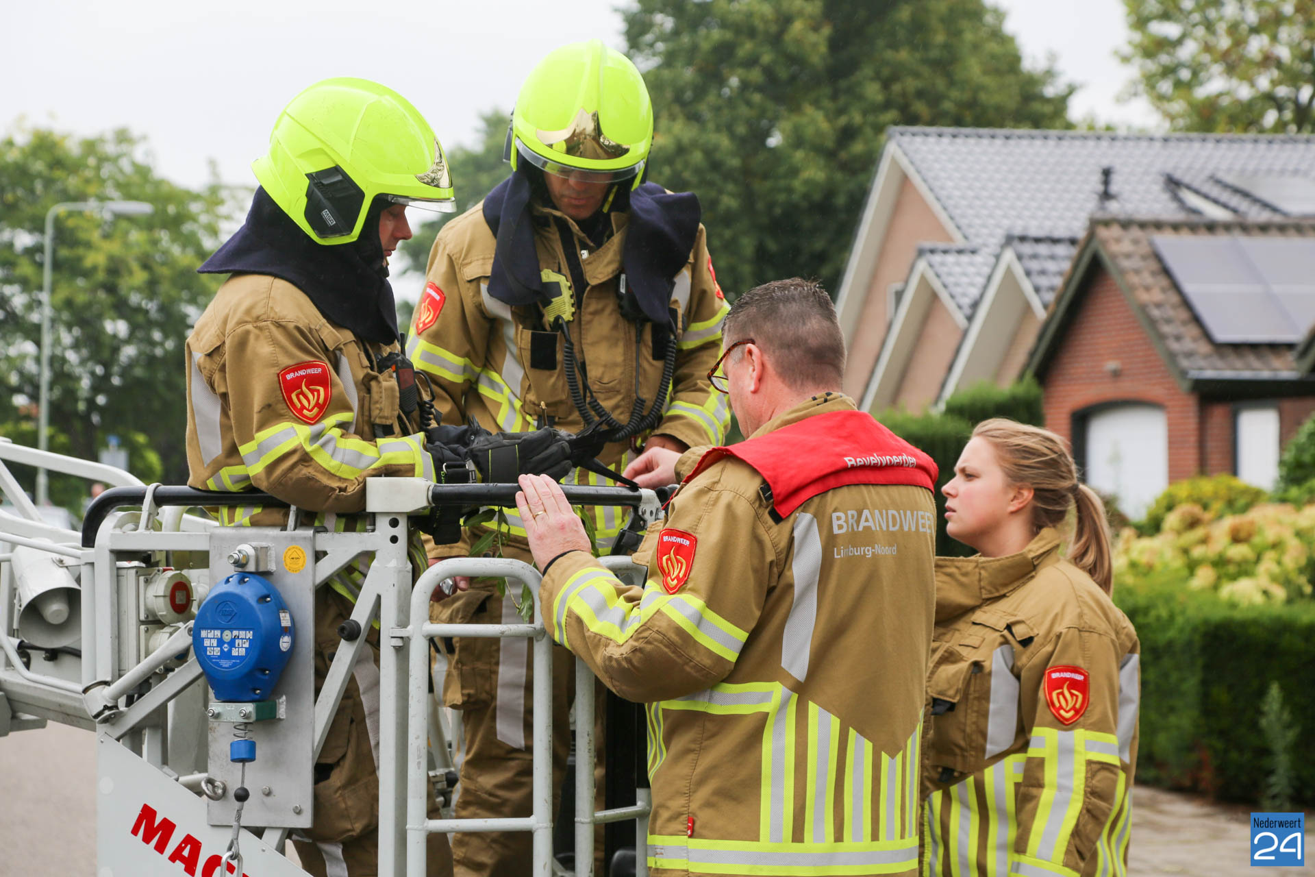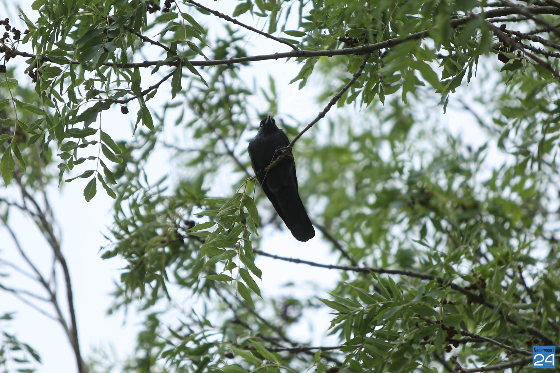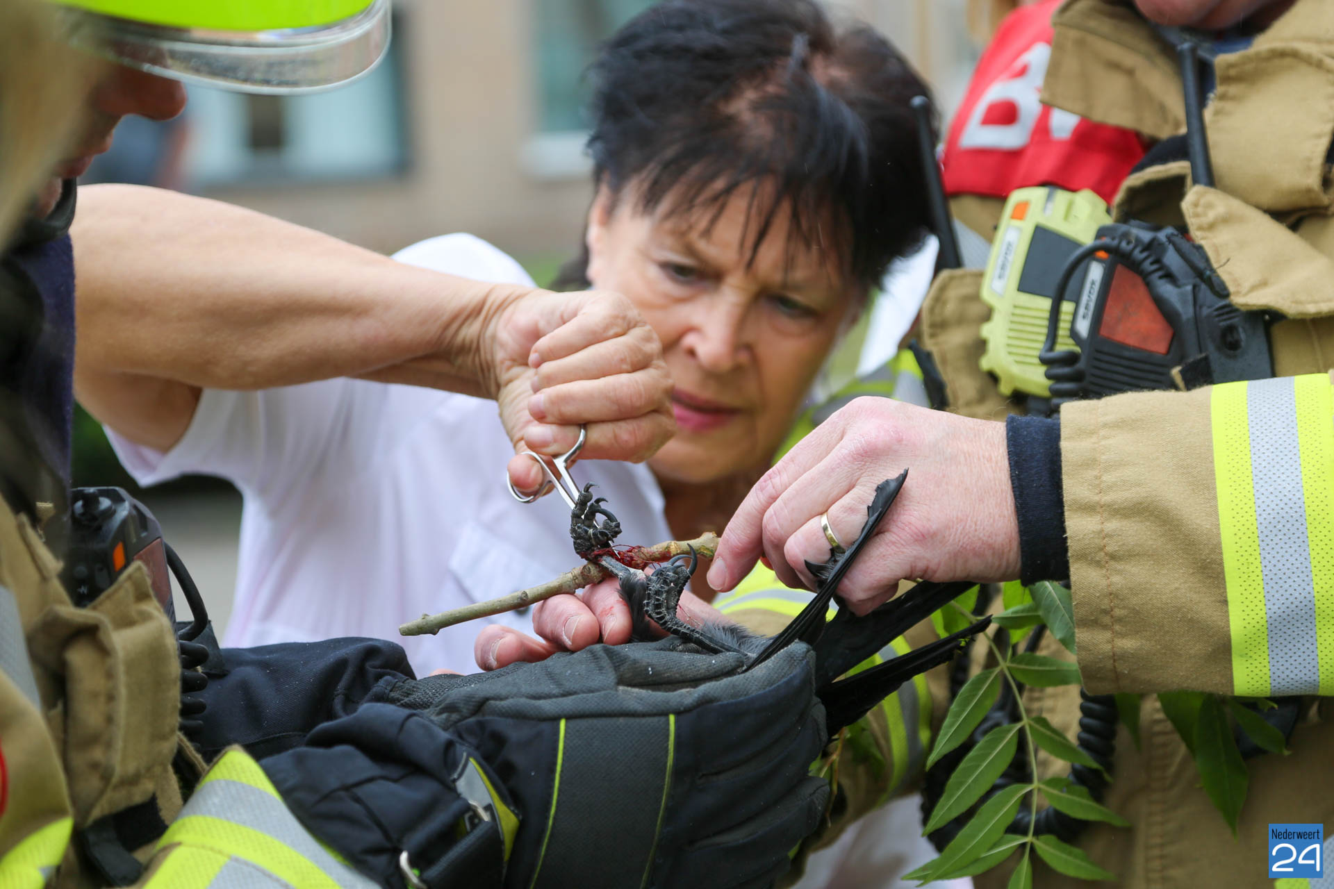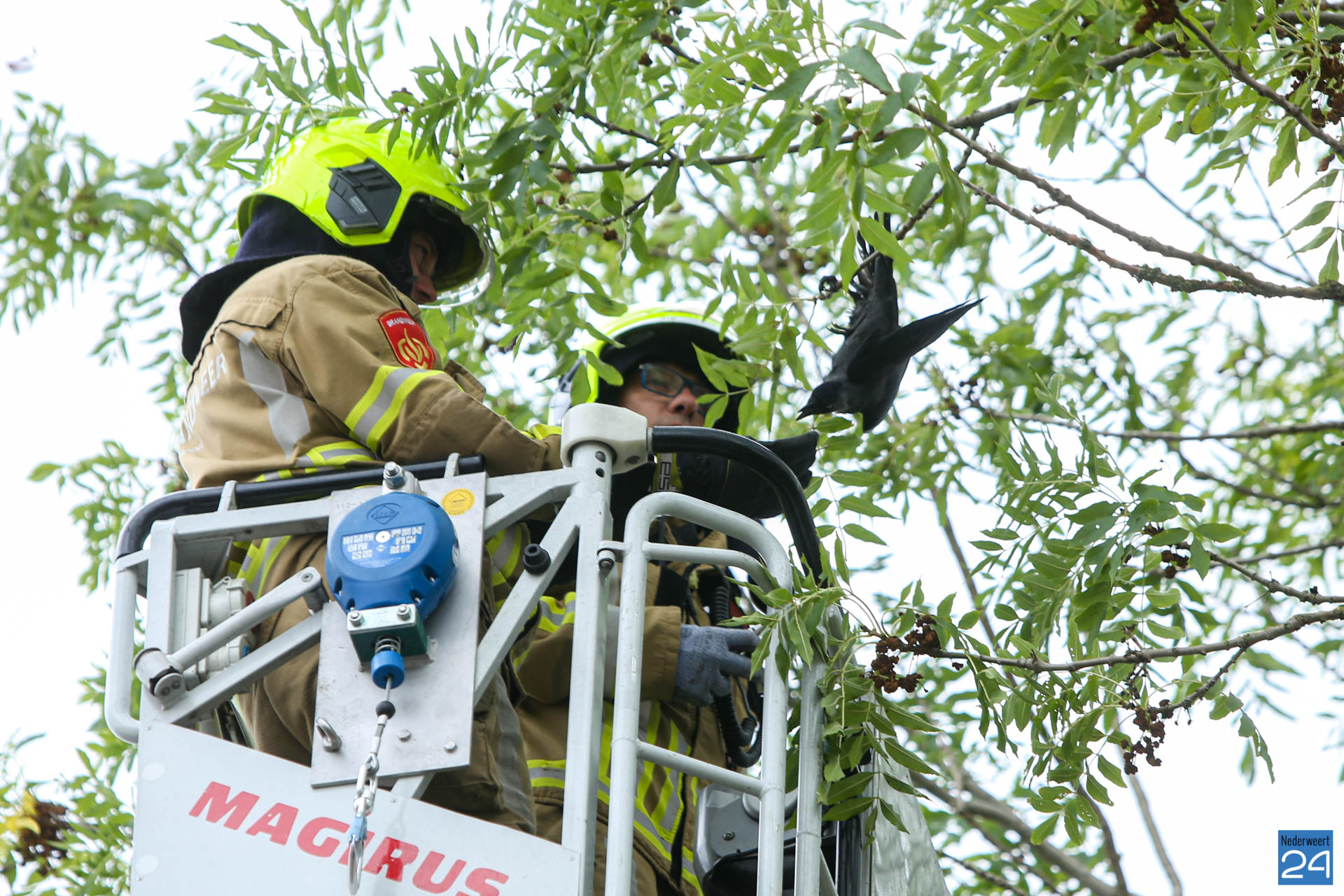 Een kauw is vrijdagmiddag door de brandweer uit een boom gered aan de Populierenstraat in Nederweert nadat het verstrikt raakte.