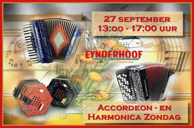 In de nieuwe muziek kiosk “Het Speelhuys” van het openluchtmuseum Eynderhoof wordt op zondagmiddag 27 september weer een accordeon/harmonica treffen georganiseerd. Voor dit Speelhuys is een groot terras waar een grote groep mensen kan genieten van accordeon en harmonica muziek.