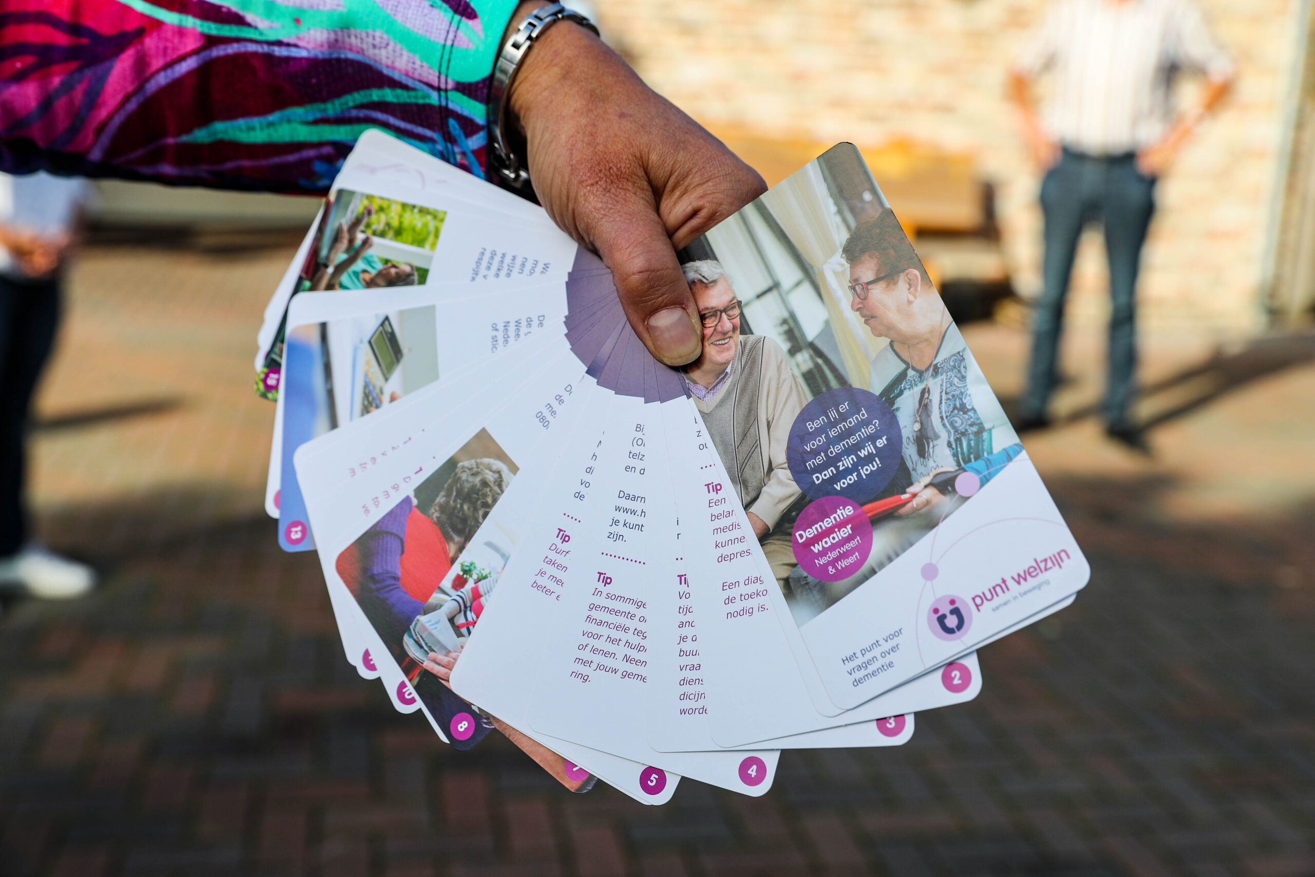 Punt Welzijn en RICK hebben in Weert & Nederweert verschillende locaties bezocht waar veel senioren wonen en hen verrast met een korte dans- en toneelvoorstelling. De voorstellingen waren gratis te bezoeken voor de bewoners en hun mantelzorgers. Punt Welzijn was op elke locatie aanwezig om informatie over dementie en mantelzorg te geven. Ook werd de dementiewaaier uitgereikt aan alle aanwezigen. De dementiewaaier is op donderdag 24 september officieel uitgereikt aan wethouder Dieteren van de gemeente Nederweert bij zorgboerderij Bosserhof. Samen met de deelnemers en de vrijwilligers van de zorgboerderij is er gesproken over dementie. De dementiewaaier is gratis bij Punt Welzijn te verkrijgen.