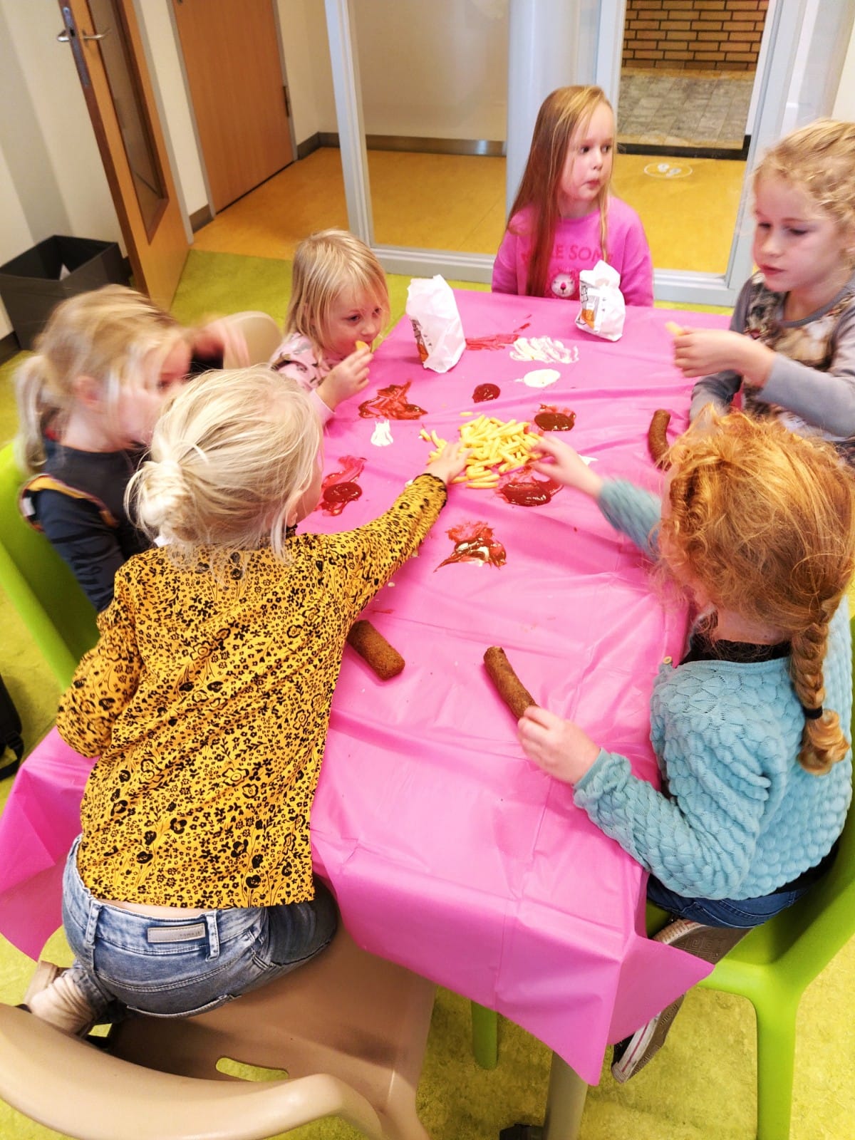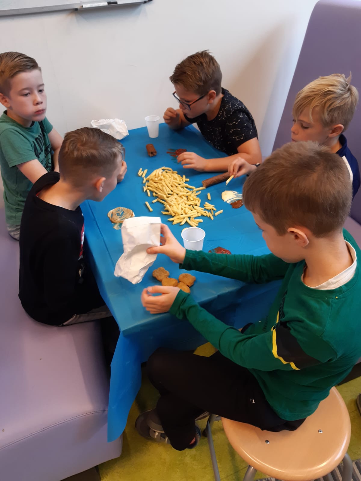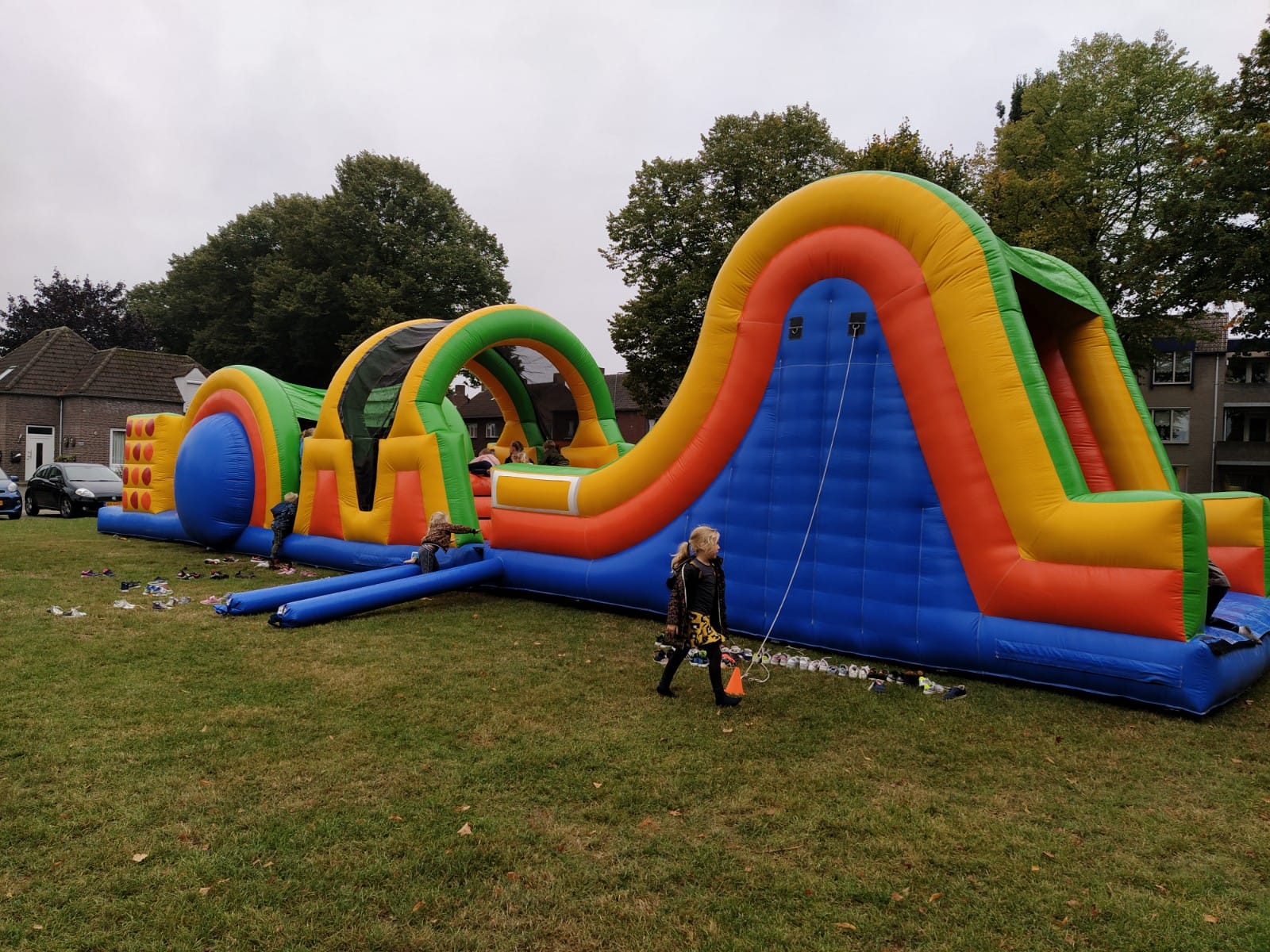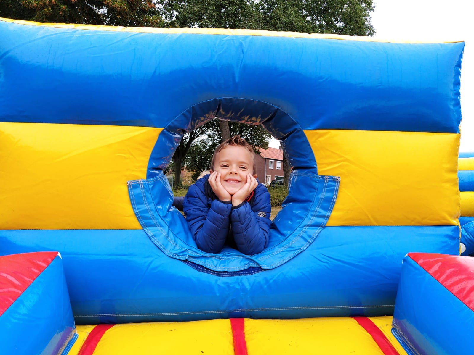 Het ‘reisje’ ging naar het Rochusplein naast de school. Dit was omgebouwd tot een springparadijs voor groot en klein. Af en toe een beetje nat, maar ze zijn niet van suiker… Het motto: ‘Ga mee op ontdekkingsreis en spring naar eigen hoogte’ werd vandaag letterlijk uitgevoerd. De kinderen konden op vier springkussens naar hartenlust springen, rollen en rennen. Ook werden ze getrakteerd op een hapje en een drankje. De frietjes, snack en als toetje een ijs smaakten heerlijk.