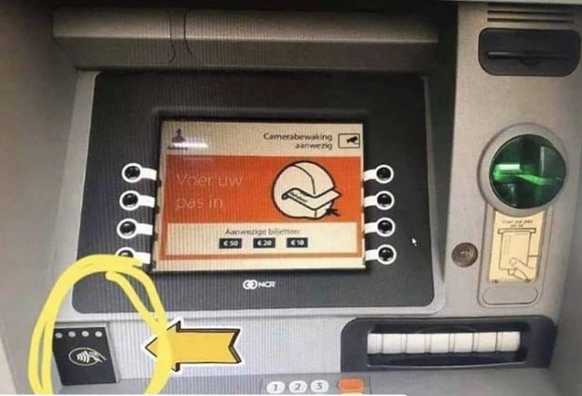 Het symbool op het apparaat herken je ongetwijfeld omdat het tegenwoordig behoorlijk gangbaar is om op deze wijze te kunnen betalen. ‘Misschien kun je via deze methode ook wel geld opnemen bij een geldautomaat’, denk je wellicht. Het apparaat hoort helaas niet op de geldautomaat en de politie laat weten dat het apparaatje vol zit met electronica en een camera. Het doel daarvan laat zich raden: jouw kaartgegevens worden gekopieerd en met de camera hopen ze je pincode af te kunnen kijken.