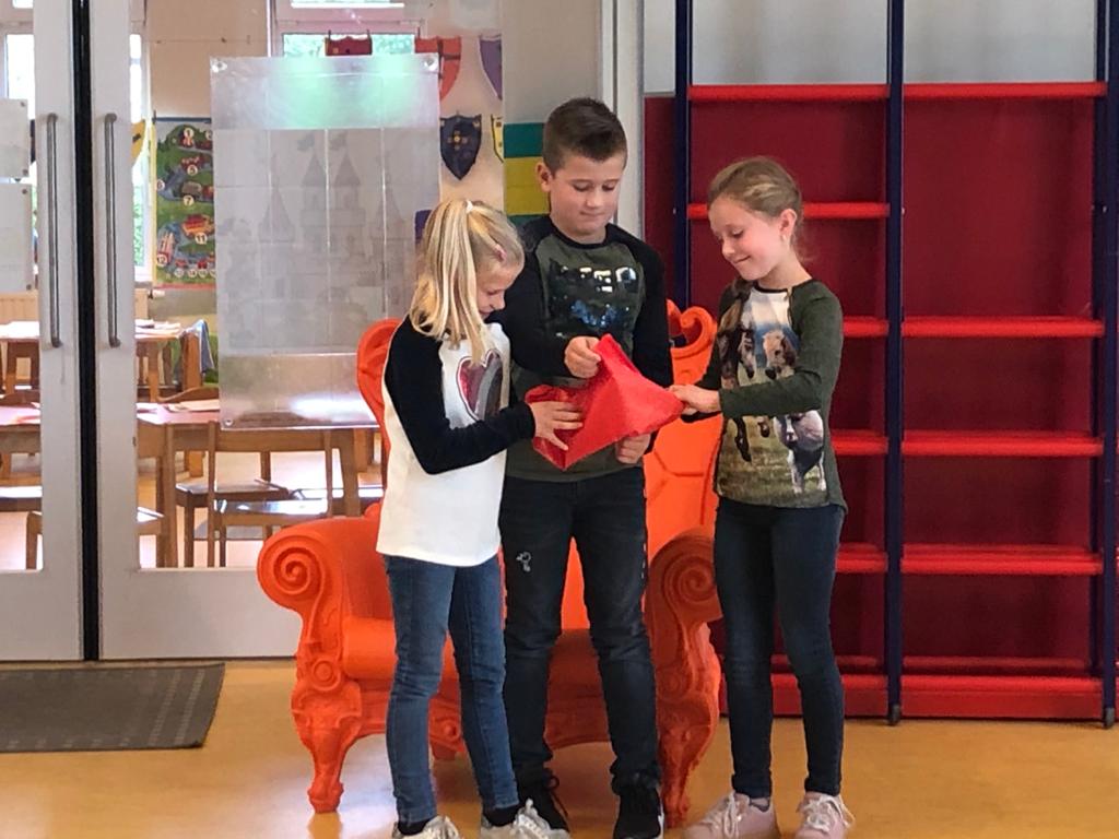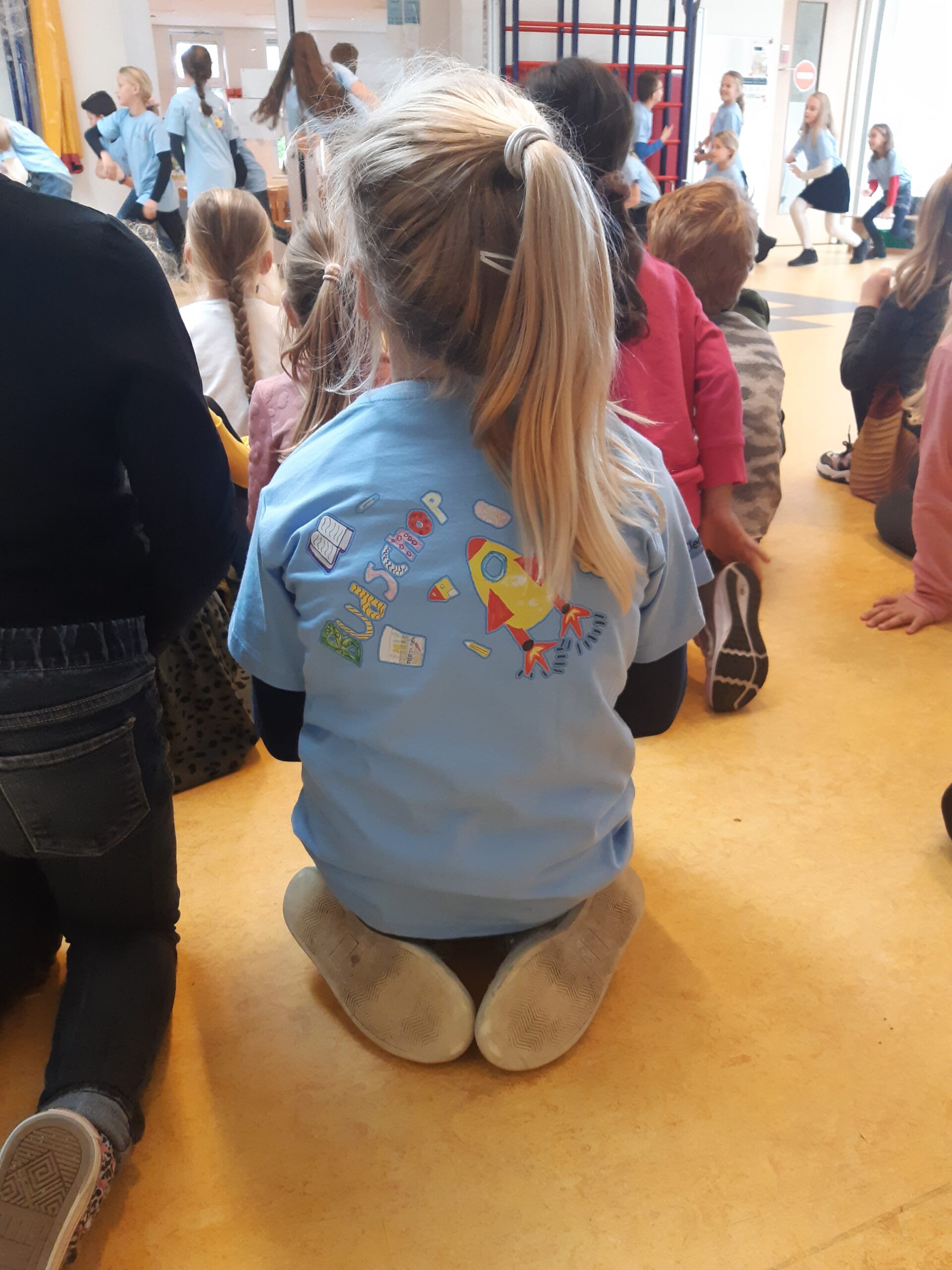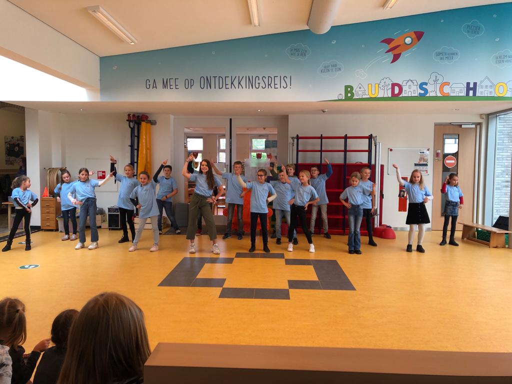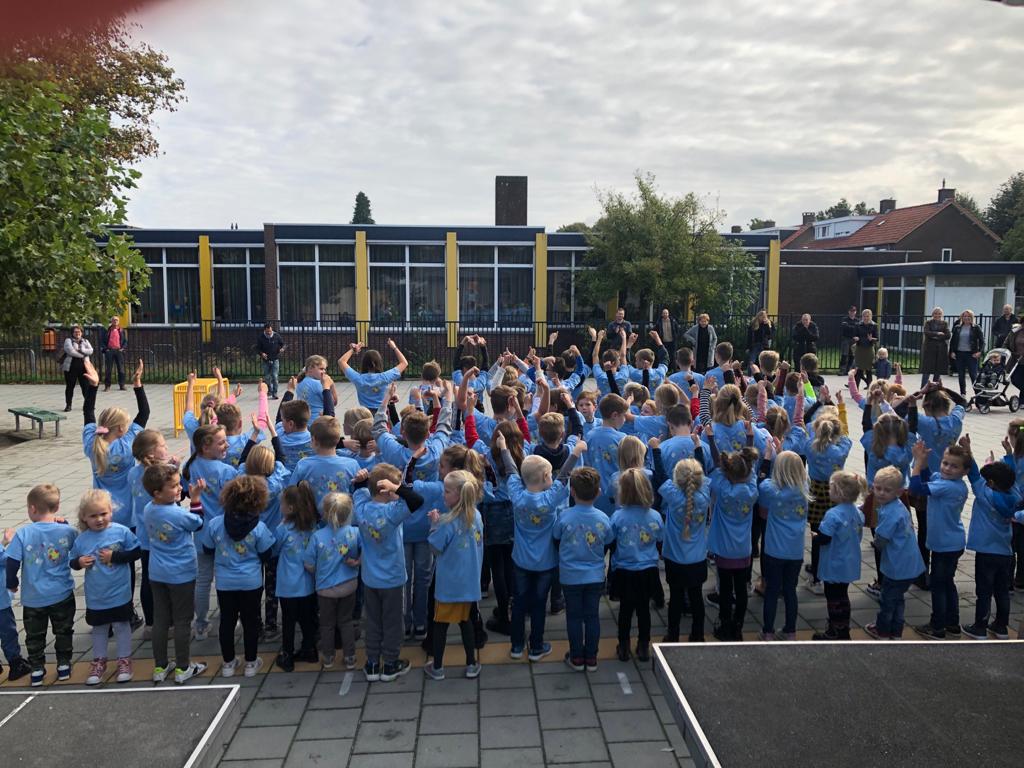 Het ontwerp van Evi is gekozen om op de shirts te laten drukken, ze heeft de welbekende raket van het IKC getekend in haar ontwerp, om samen op ontdekkingsreis te gaan. Vandaag kwamen Mart, Roy en Hay (de heren van de Clement Group) naar IKC Budschop om de shirts te onthullen en officieel aan de kinderen te overhandigen. De kinderen hebben hun shirt meteen gepast en iedereen vond ze erg mooi! Op het nummer ‘En toen’ van de Kinderboekenweek werd gedanst en bleek ook dat de shirts handig zitten om in te bewegen.