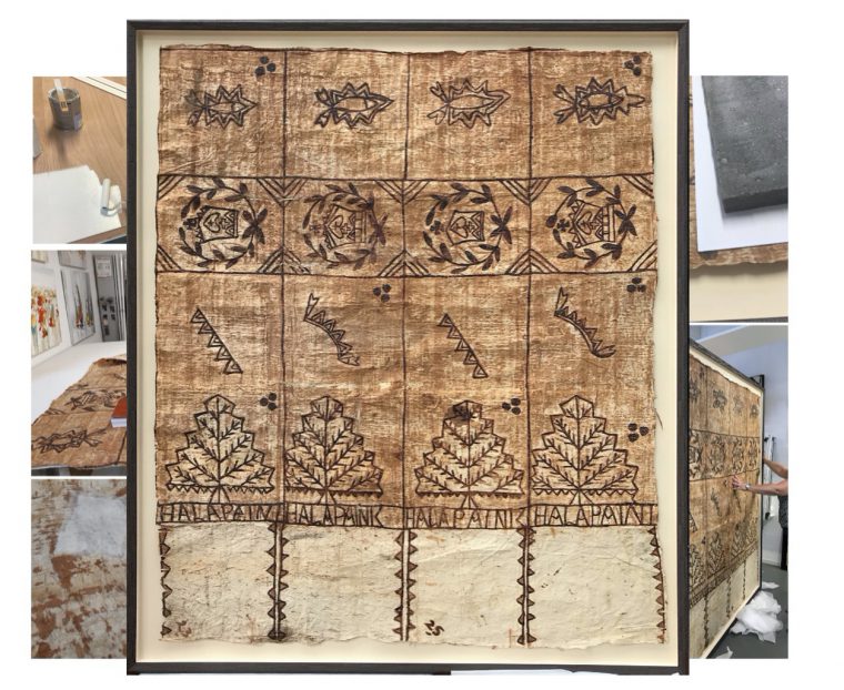 Het maken van een Tapa kleed is een tijdrovende en intensieve klus. Na vele handelingen komt dan uiteindelijk een Tapa tot stand. We hebben ons eerst verdiept in het proces van Tapa en zijn er daarna mee aan de slag gegaan! Eerst is het doek gerestaureerd, waarna het vast is gezet, met lipjes op zuurvrij karton. Het karton is verlijmt op foam, zodat het Tapa kleed een mooi verdiept effect krijgt. Uiteindelijk zijn we tot een prachtig resultaat gekomen, waarin de Tapa perfect tot zijn rechtkomt, met daaromheen een krachtige lijst.