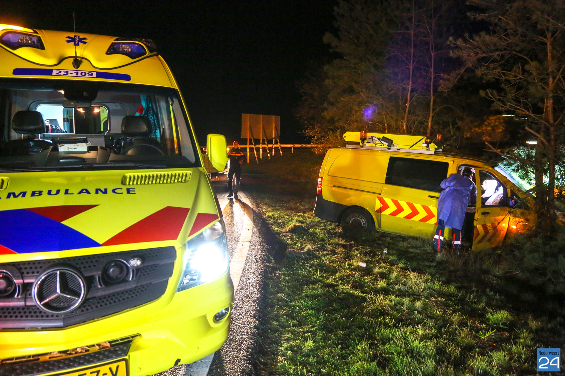 Een werkbus raakte op de afrit van de weg en kwam met de voorzijde in een bossage terecht. De hulpdiensten waaronder; brandweer, ambulance en politie werden vervolgens opgeroepen. De bestuurder kon op eigen kracht het voertuig verlaten, en dus was de komst van de brandweer niet meer nodig.