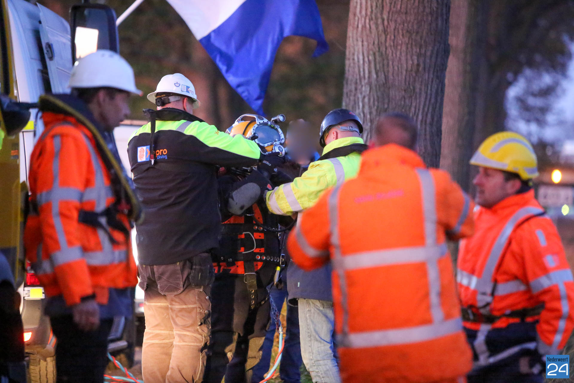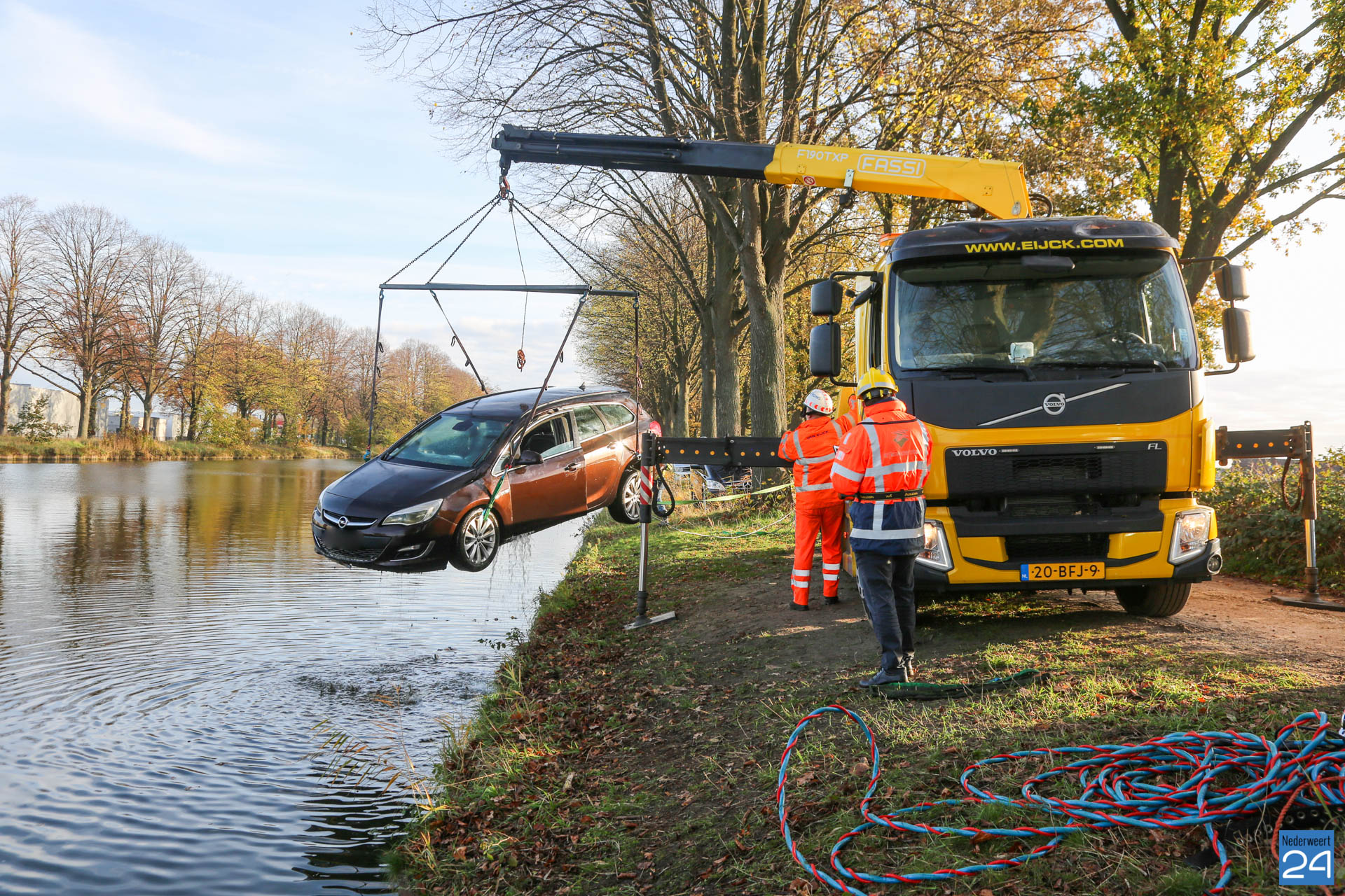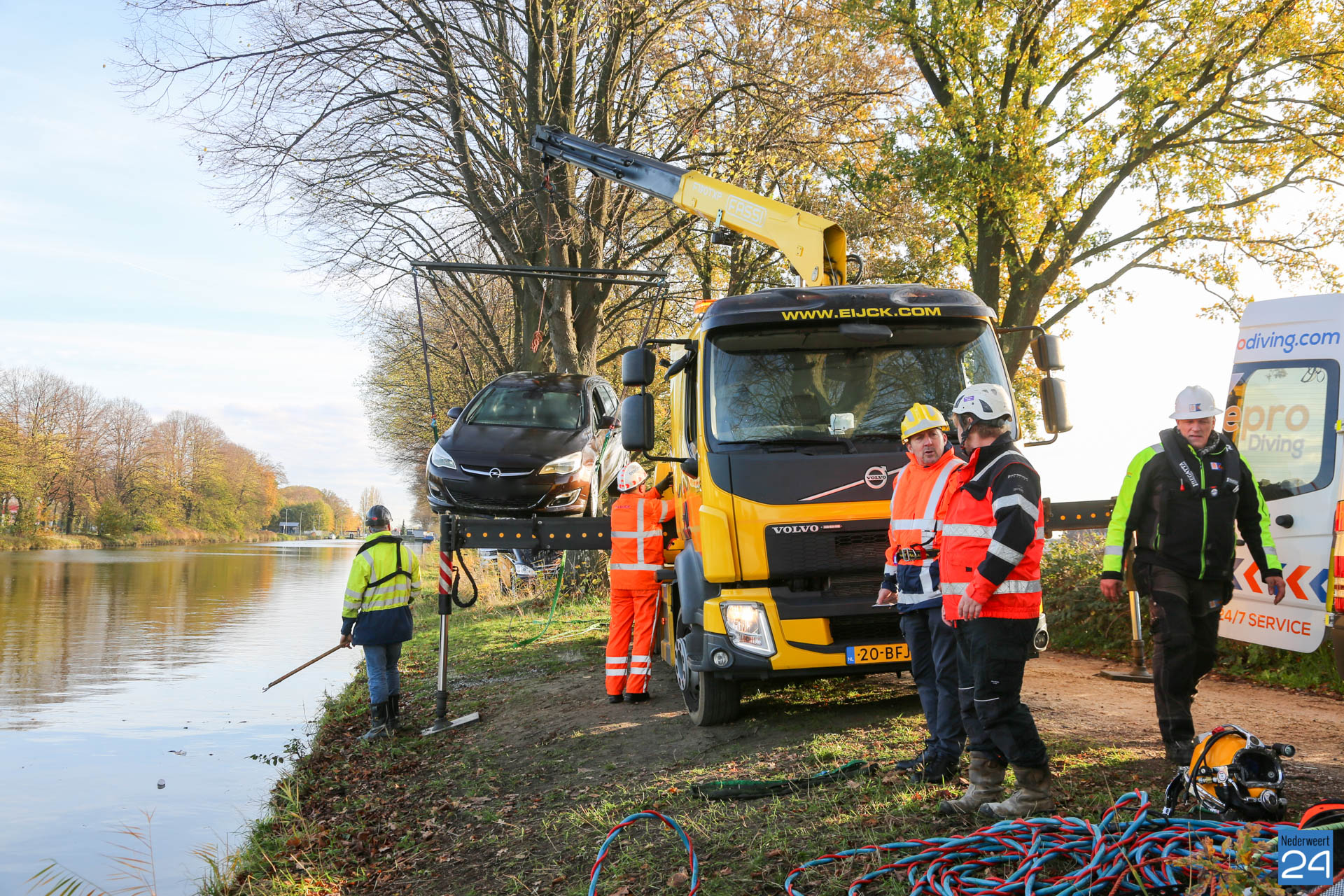 Duikers hebben samen met een berger het voertuig uit het water gehaald. Inmiddels is de kletsnatte auto onderweg naar de garage. Deze ongeluksdag, vrijdag de 13e,  zullen de twee vissers niet snel vergeten.
