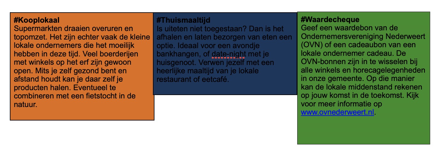 Het coronavirus heeft een grote impact op onze samenleving. En niet in de laatste plaats op al onze hardwerkende ondernemers. Wethouder Koolen (Economie) vraagt aandacht voor de lokale middenstand: “20 November is de Dag van de Ondernemer. Een mooi moment om onze Nederweerter ondernemers een hart onder de riem te steken in deze turbulente tijd.”
