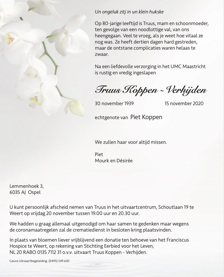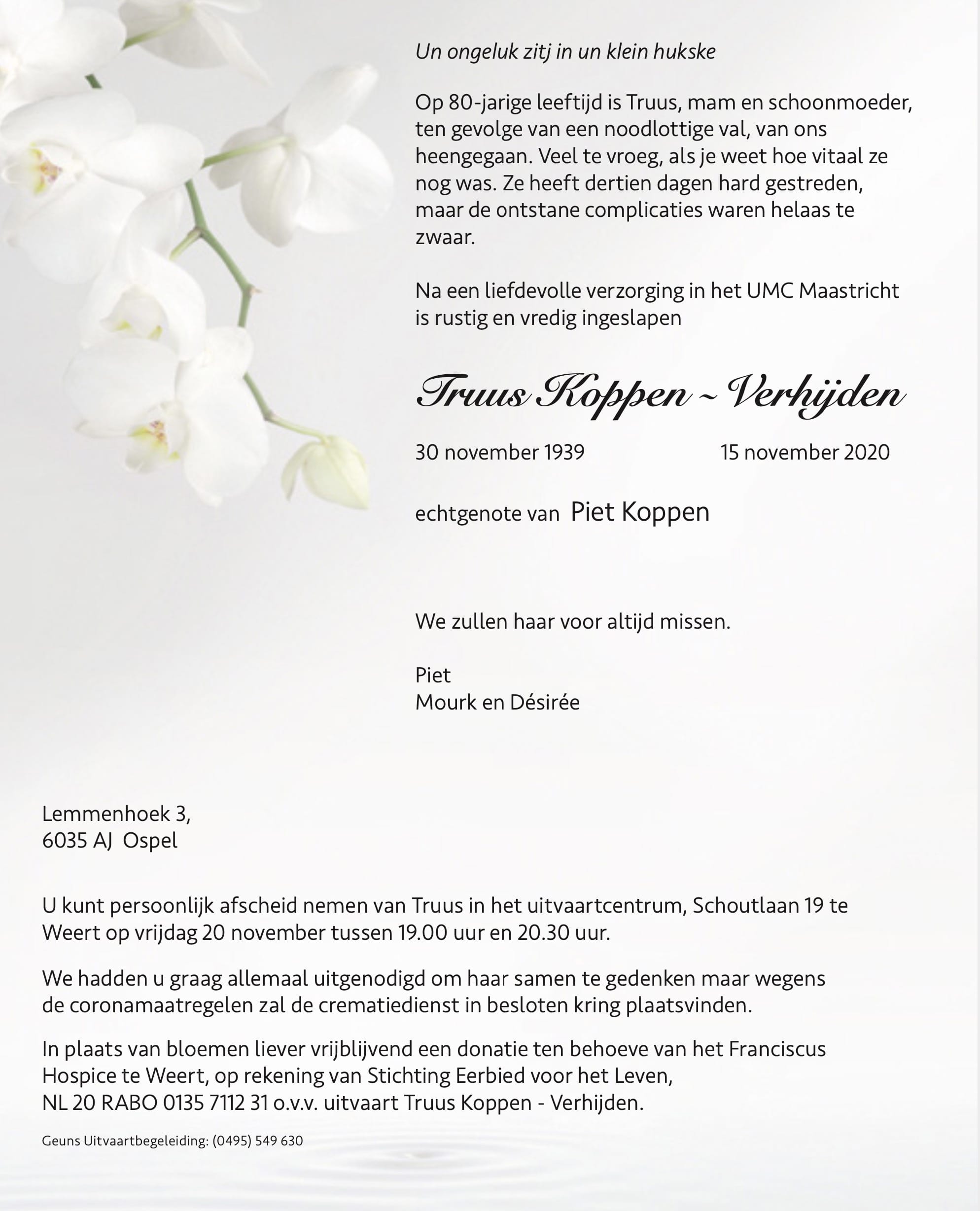 Overlijdensbericht: Truus Koppen ~ Verhijden †