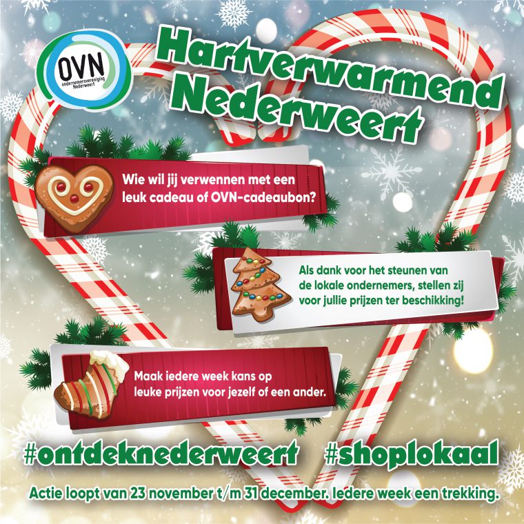 Als ondernemer in de gemeente Nederweert zijn we dankbaar voor alle mensen die niet online gaan, maar ons steunen en lokaal shoppen of bestellen bij onze horeca. Ondanks de lastige coronatijd en om jullie te bedanken als trouwe klant, willen we de feestmaanden een feestelijk tintje geven. Daarom starten we met de actie HARTVERWARMEND NEDERWEERT. Als dank voor jouw bezoek, stellen onze ondernemers leuke prijzen beschikbaar.