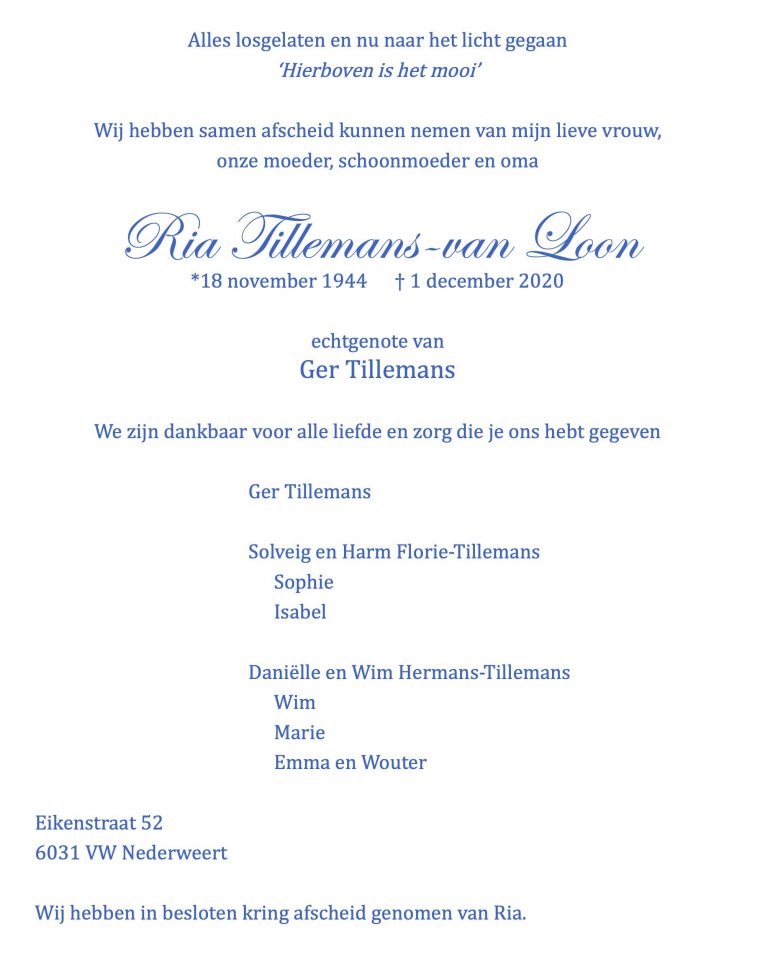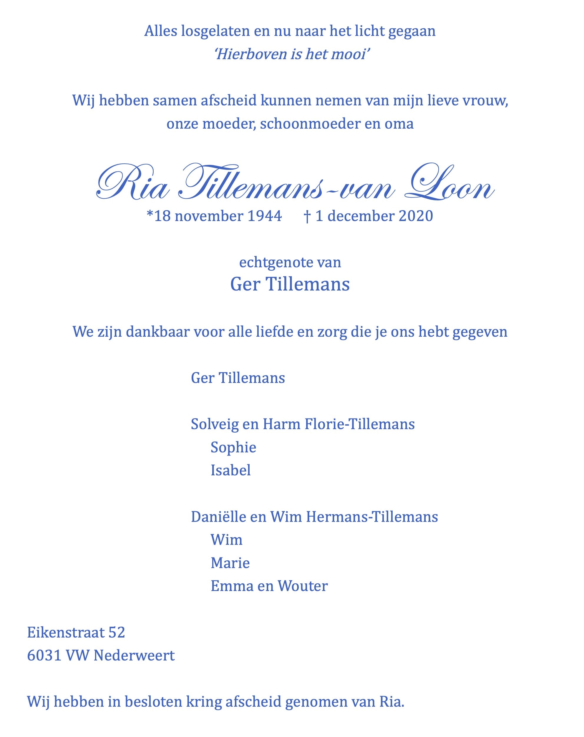 Ger en familieleden gecondoleerd met het verlies van Ria
