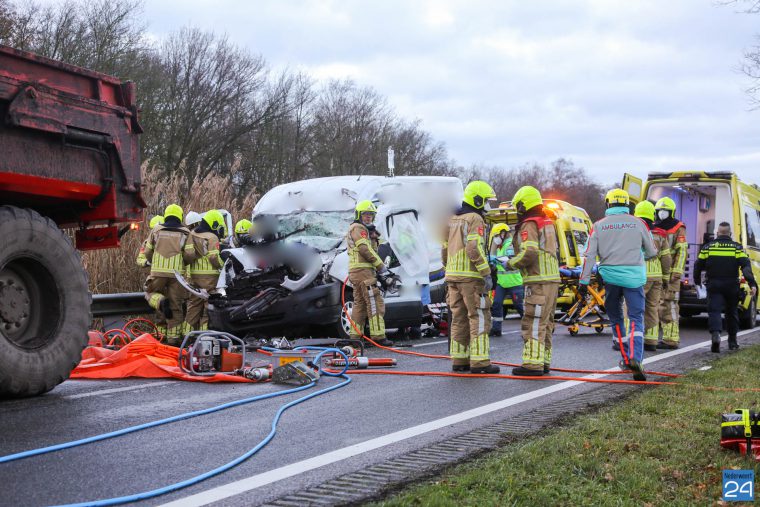 Waarschijnlijk is een bedrijfsbus achter op een tractor gereden. Twee inzittenden worden door de hulpdiensten uit hun positie gehaald. Wat de oorzaak is van het ongeval is nog niet bekend.