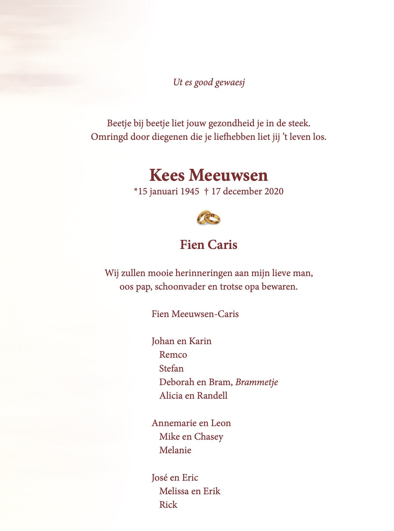 Gecondoleerd met het overlijden van Kees … Fien en kinderen en kleinkinderen
