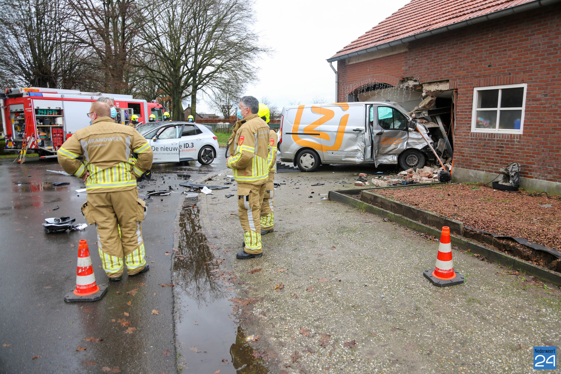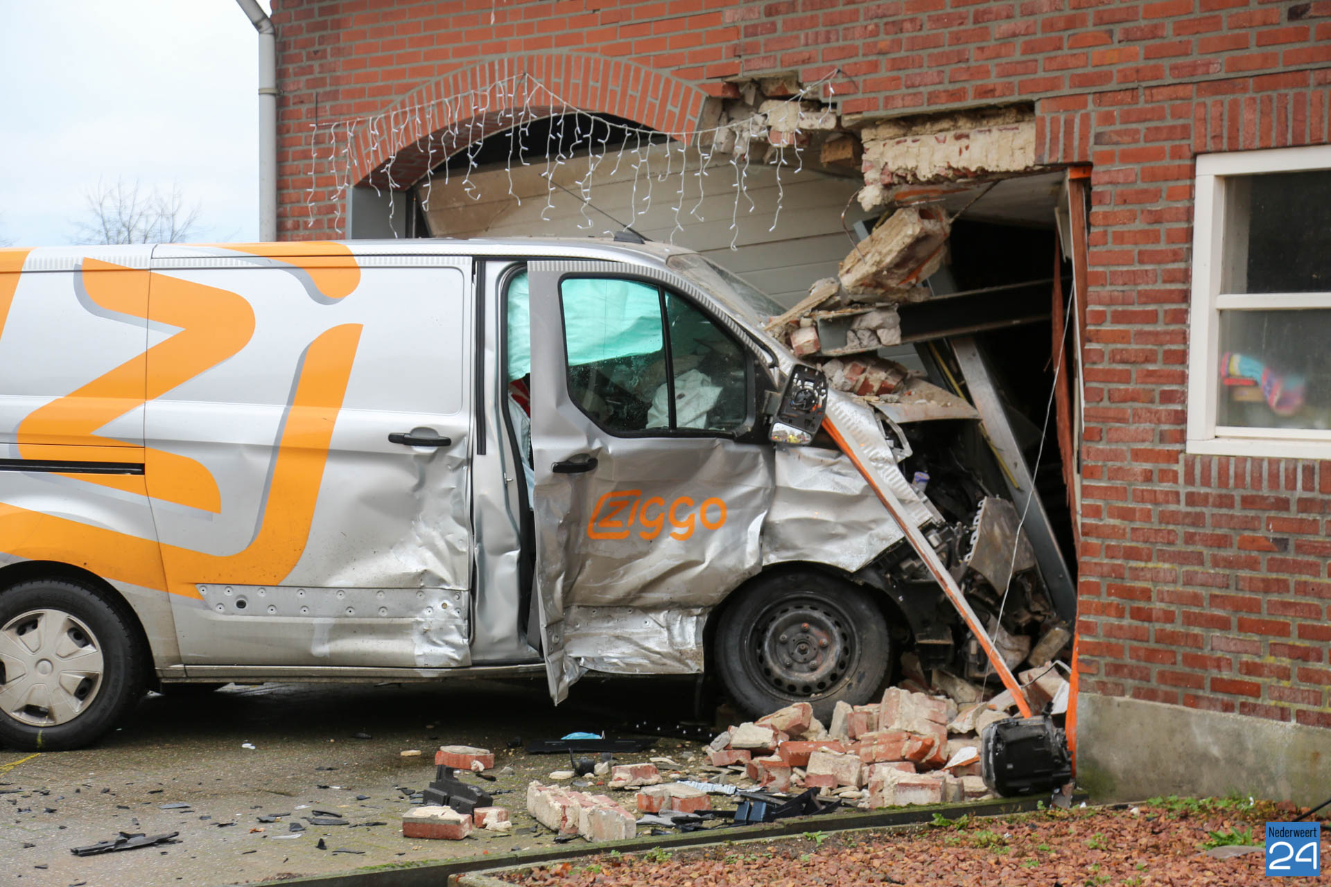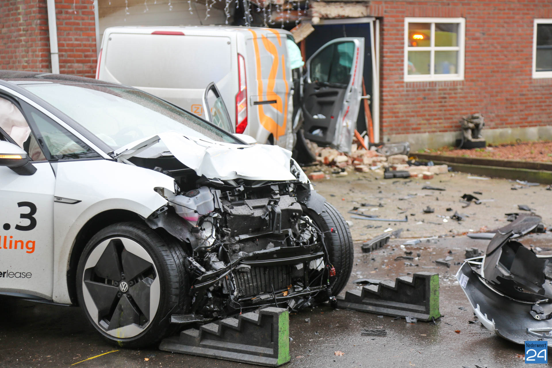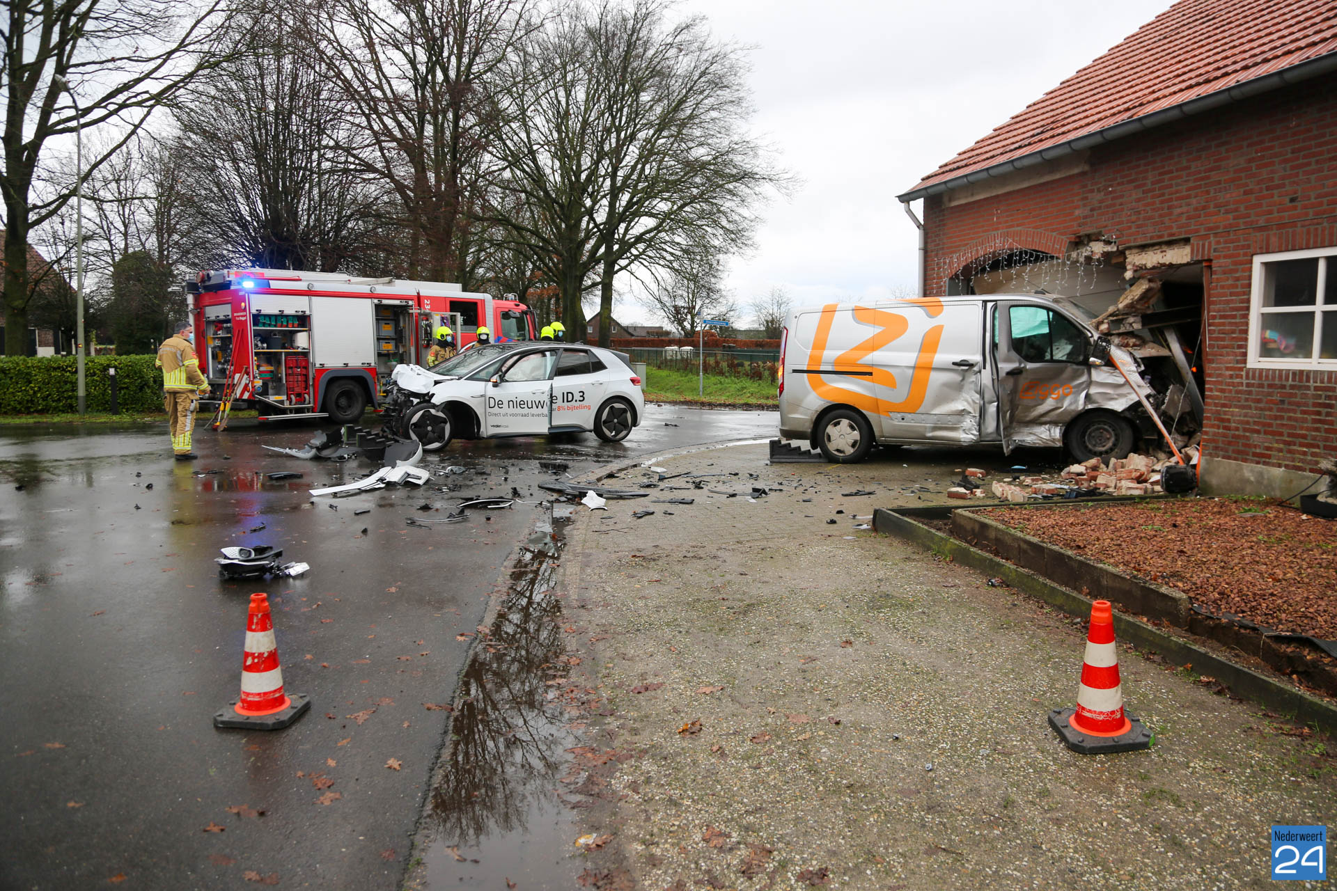 Wonder boven wonder bleven alle betrokkenen ongedeerd. Een personenauto en een busje kwamen hard met elkaar in botsing. Het busje belandde in een nabij gelegen schuur welke vast zat aan een woonhuis. Hulpdiensten kwamen massaal ter plaatse.