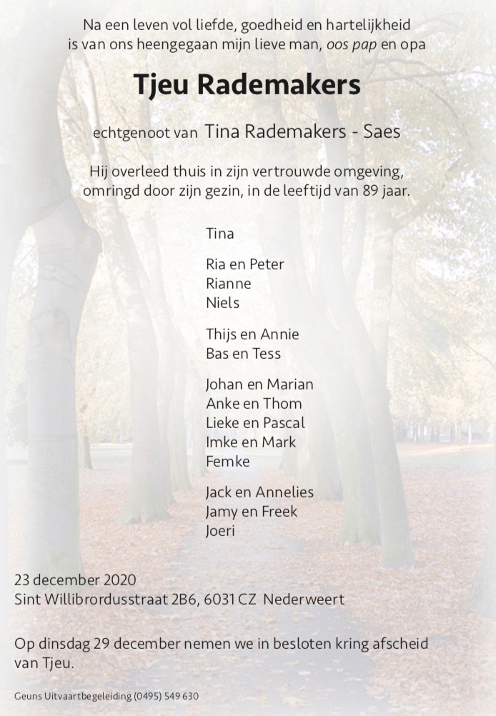 Beste familie Rademakers wij zijn wel ver weg maar in deze dagen kort bij jullie. Wij denken terug aan veel warme ontmoetingen met jullie als gezin. Sterkte de komende tijd..