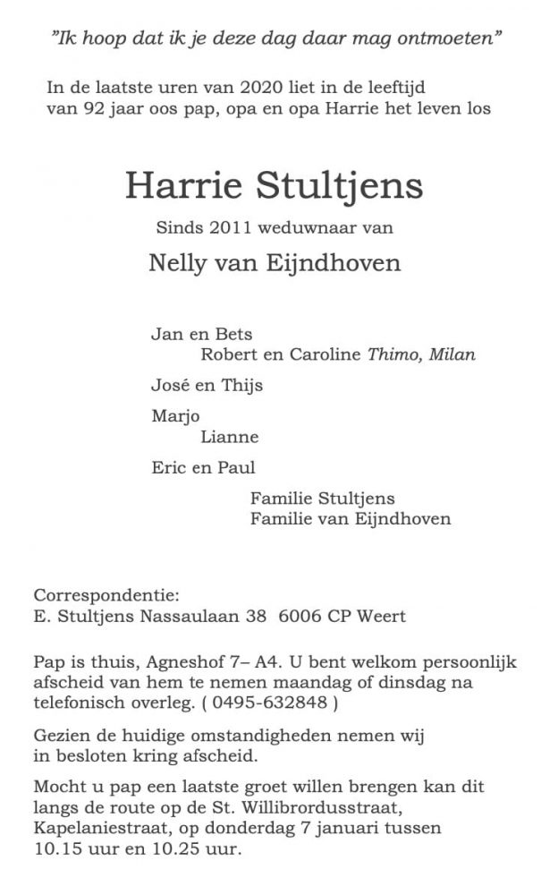 Gecondoleerd bij het overlijden van Harrie Stultjens
