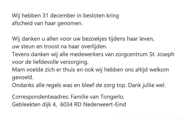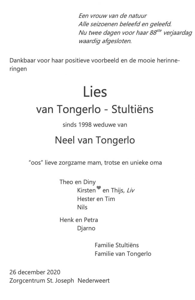 Overlijdensbericht: Lies van Tongerlo – Stultiëns †
