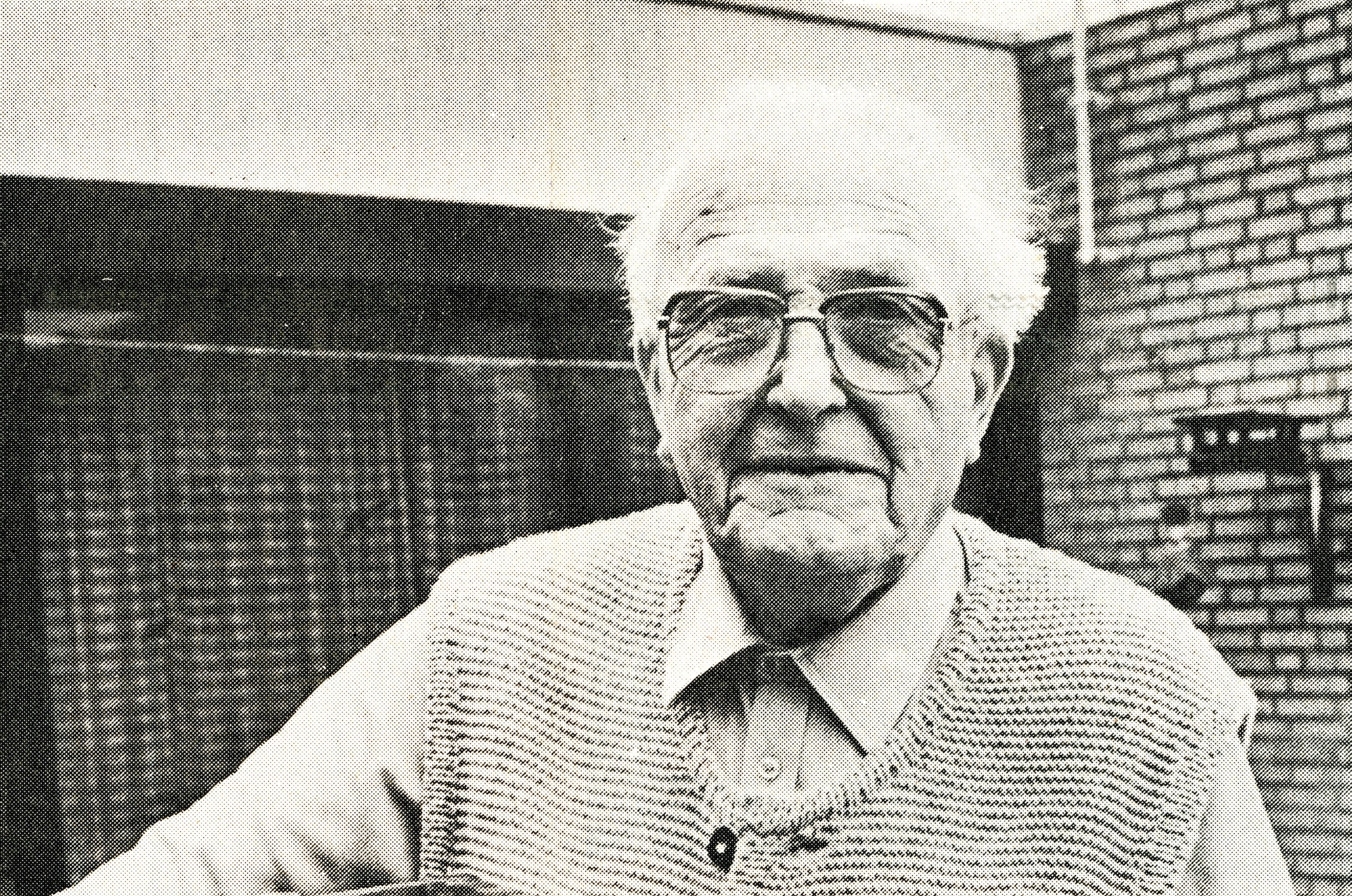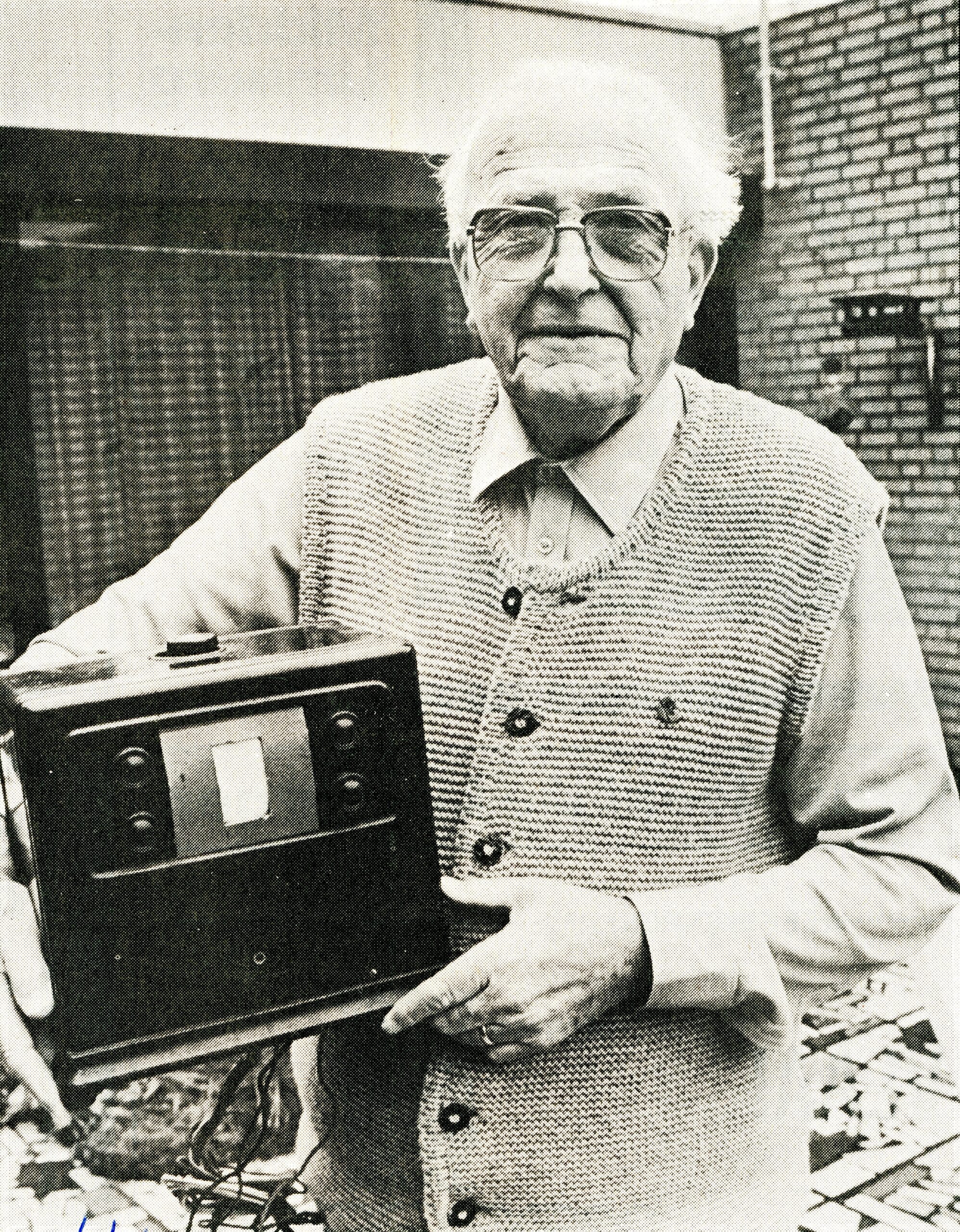 Freek Kerkhof uit Nederweert met de door hem ontwikkelde eerste televisie uit 1936. Dagblad De Limburger, 8 januari 1986 (Alfons Bruekers – Stichting Geschiedschrijving Nederweert.