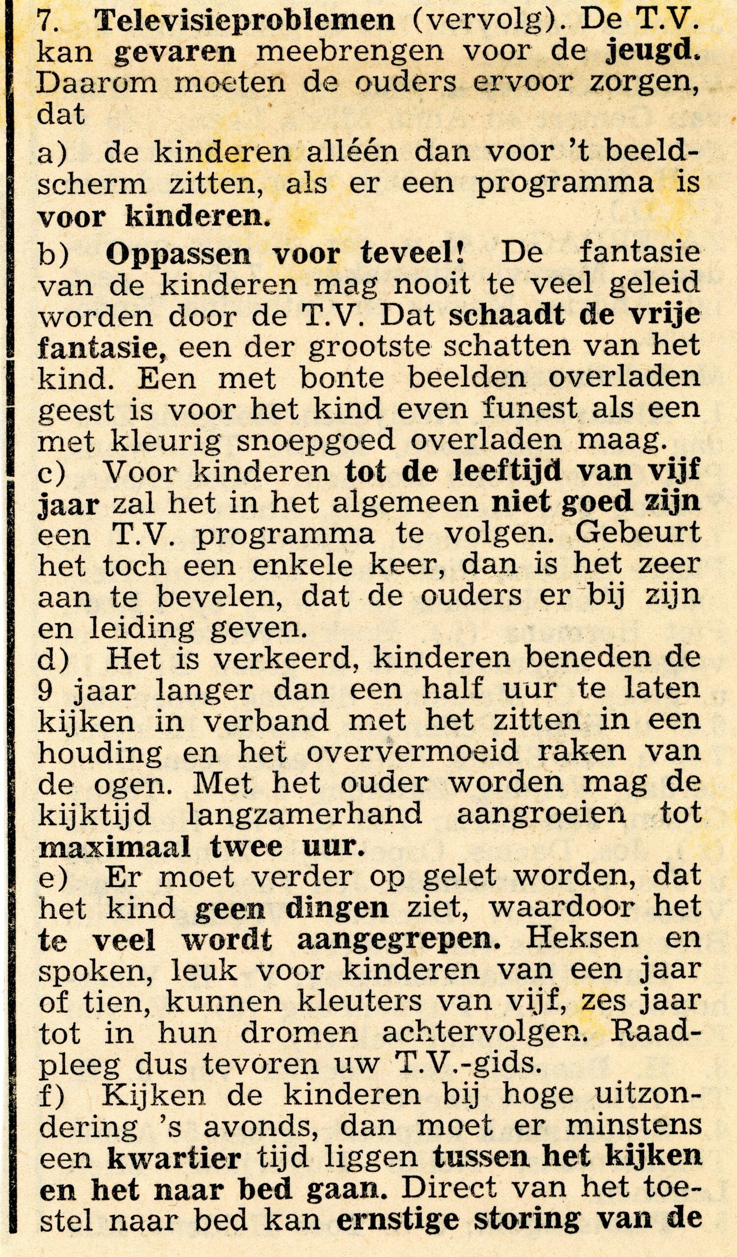 Het nabuurschap was groot in die dagen. Wie nog geen TV had, ging bij de buren kijken. De wonderlijke komst van bewegend beeld in de woonkamer leidde tot hilarische situaties. Zoals de vrouw die bits tegen haar zus zei: ‘Doot dich ‘ne schölk (schort) veur, want di-j zeen dich heej zitte’. De opkomst van de televisie werd door de plaatselijke geestelijkheid als een grote bedreiging gezien. Al in 1961 richtte pastoor Kessels van Nederweert zich verontrust tot de parochianen van de St. Lambertusparochie. Hij schreef een artikel onder de veelzeggende titel ‘Televisieproblemen’ en voorzag tal van gevaren voor de jeugd. ‘Er moet verder op gelet worden dat het kind geen dingen ziet waardoor het teveel wordt aangegrepen’, aldus Kessels. Voor kinderen beneden de vijf jaar was TV kijken volgens de pastoor volledig taboe, want ‘dat schaadt de vrije fantasie, een der grootste schatten van het kind’. En voor de volwassenen waren uiteraard alleen de degelijke programma’s van de streng-katholieke KRO geschikt. Het mocht allemaal niet baten. Letterlijk álle huiskamers werden vanaf de zestiger jaren gevuld met beeld en geluid. En op de daken van de huizen verscheen een oerwoud van televisie-antennes. Die zijn inmiddels ook al lang uit het zicht verdwenen. Net als de goedbedoelde maatschappelijke waarschuwingen van pastoor Kessels.