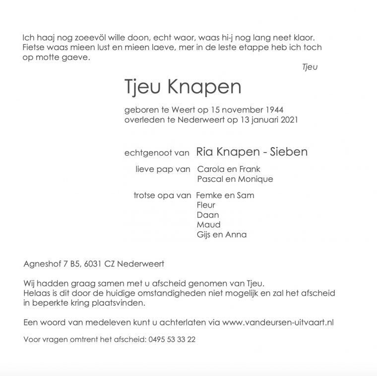Gecondoleerd met het verlies van Tjeu. Sterkte met de komende dagen. Lies en Henk Joosten-Knapen uit Neerkant.