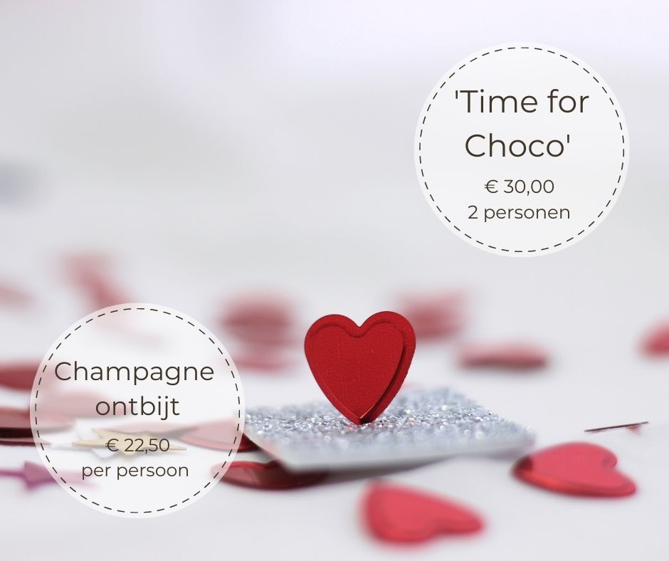 Het champagne ontbijt is te reserveren voor € 22,50 per persoon. Hierbij krijg je diverse broodjes, beleg, fruit, zoete hapjes, dessert en natuurlijk een fles champagne. Bij het arrangement ‘time for choco’ staat alles in het teken van chocola. De liefde en chocolade past natuurlijk perfect bij elkaar! De prijs van dit arrangement is € 30,00 en is voor twee personen. Het pakket bestaat uit diverse chocolade hapjes, zoals een chocolade croissantje. Ook krijg je een mini chocolade fondue. Thuis moet de chocolade wel nog eventjes gesmolten worden én dan kan je bijvoorbeeld lekker een marshmallow erin dippen.