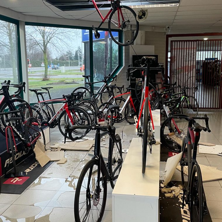 De dieven hebben een grote ravage aangericht. Er is een groot gat ontstaan in het dak van de showroom. De inbraak vond plaats rond de klok van half 1. De dieven zijn verstoord door het alarmsysteem in de zaak.