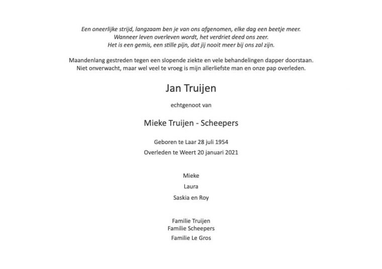 Ik ben geschrokken van dit bericht . Ik kende jan op kuur in oosterijk voor reuma en hebben een mooie 3 weken gehad . Heel veel sterkte voor de komende tijd .