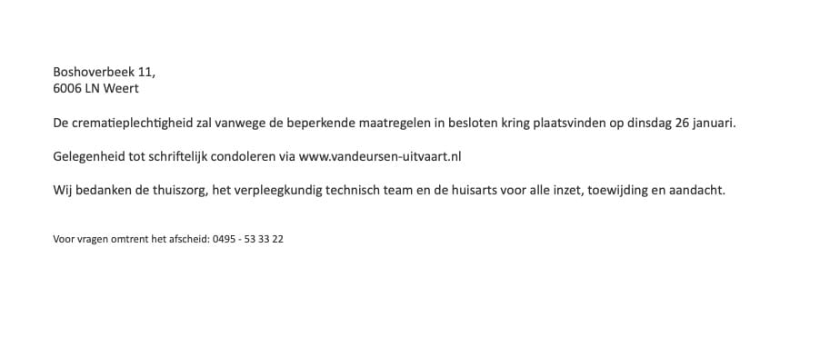 Mieke, kids, femilie en vreendje, gecondoleerdj met dit vurlees.. Stérrikdje geweensj de tieët dae noow koome gieët. Jan: detj uch good moog gaon dao boove