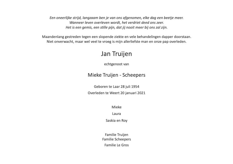 Mieke en kinderen, gecondoleerd en heel veel sterkte met het verlies van Jan