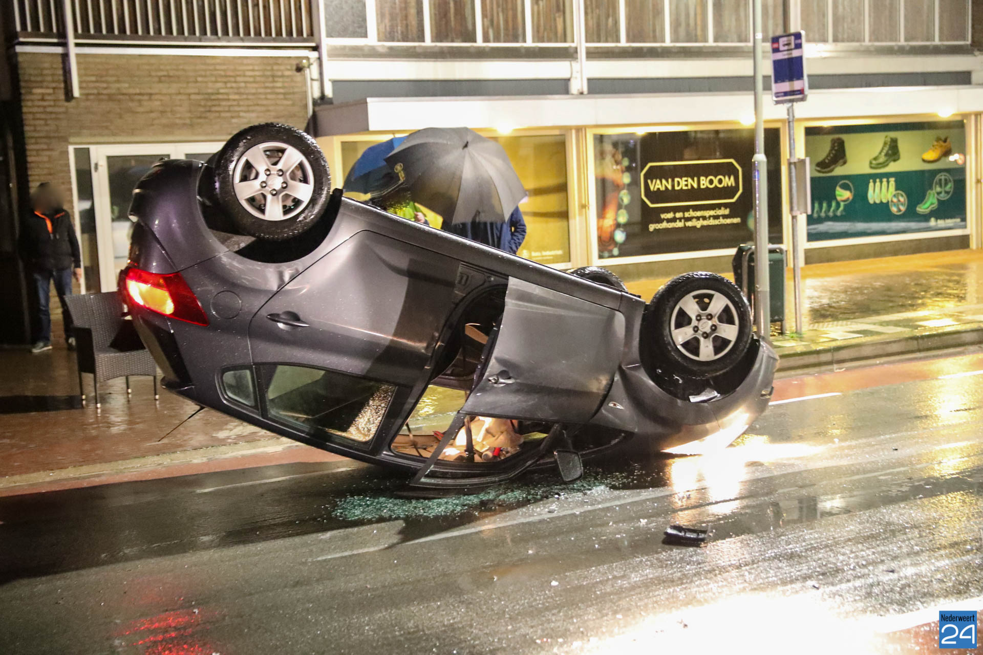 Woensdagavond is een auto op de kop terecht gekomen op de Onze Lieve Vrouwestraat in Ospel. Het ongeval gebeurde ter hoogte van het Aerthijsplein in Ospel.