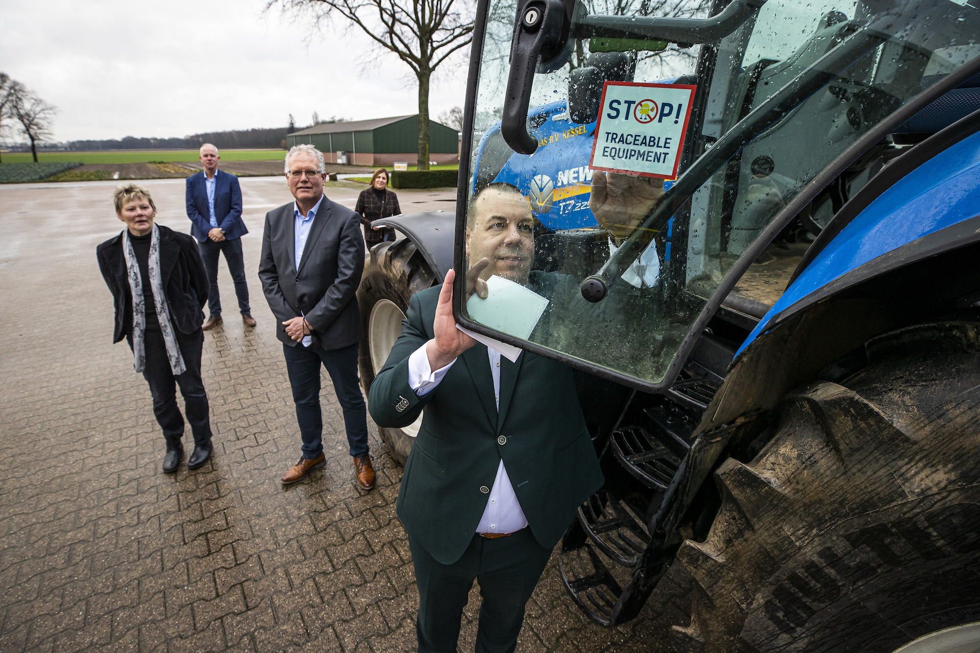 De campagne #StopDiefstal is op vrijdag 5 februari in Limburg afgetrapt op Loonbedrijf Maas BV in Kessel, waar Jeanne Hesen en haar zoon Harrie de eerste set van stickers en labels in ontvangst namen van gedeputeerde Robert Housmans (Sociale Agenda, Zorg en Veiligheid) van de provincie Limburg. ‘De campagne draagt bij aan het realiseren van een veiliger ondernemend Limburg en vormt een speerpunt in onze Veiligheidsagenda Limburg. Het is daarbij belangrijk dat we, naast opsporen, gezamenlijk met partners investeren in stevige preventie en het voorkomen van criminaliteit in het buitengebied’, vertelt gedeputeerde Housmans.