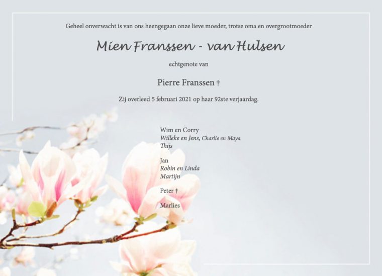 Overlijdensbericht: Mien Franssen – van Hulsen †