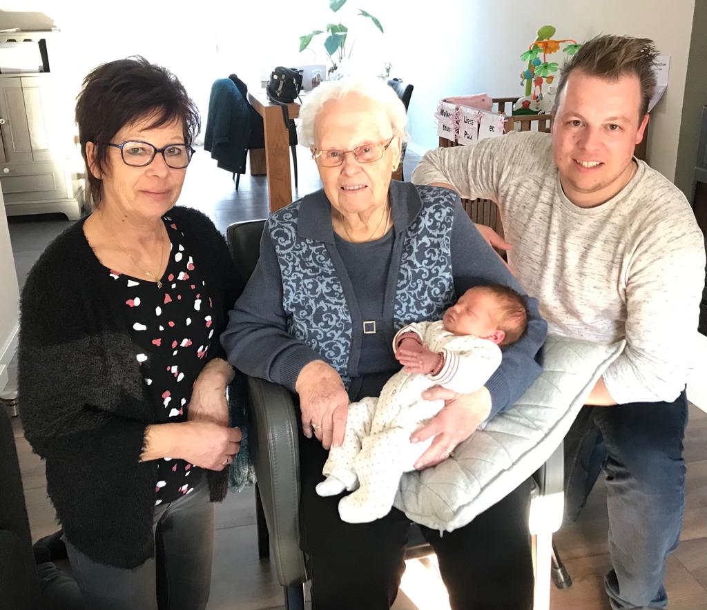 Een uniek moment voor Leivere én de familie natuurlijk. Overgrootmoeder Mia Pijpers-van de Wal is 96 jaar en nog steeds zelfstandig wonend aan de Dorpstraat. Haar dochter Maria Vaes-Pijpers van 65 jaar is voor de eerste keer trotse oma geworden. Zoon Jeffrey Vaes van 35 is met de geboorte van zijn dochter Puck Vaes eerste keer vader geworden.