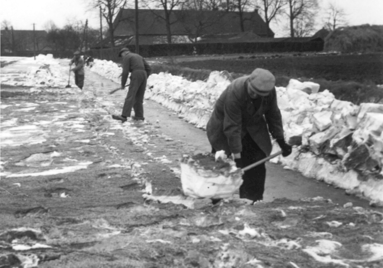 Aanvankelijk werd het sneeuwschuiven met behulp van een v-vormig werktuig gedaan. Dat was gemaakt van hout en ijzer en werd door een paard voortgetrokken, zodoende de sneeuw uit elkaar schuivend. Later werd dat werktuig achter de wagen of tractor gehangen. In die tijd, stonden twee mannen in de openlucht, achter in de bak van de dus voorzichtig rijdende vrachtwagen met een schop het zand en later het zout of een mengsel daarvan te verdelen over de weg. Later schepten ze dat in de strooier op de vrachtwagen en werd het zo verspreid over de wegen. En dat dan soms bij -15 graden en ook ‘s nachts. Barre tijden dus. En de andere gemeentewerkers maakten met de schop de stoepen sneeuwvrij bij de scholen en de kerken. Pas jaren later, zo halverwege de jaren ‘70, kwamen de strooiers op de vrachtwagen of achter de tractor om het zout te strooien.