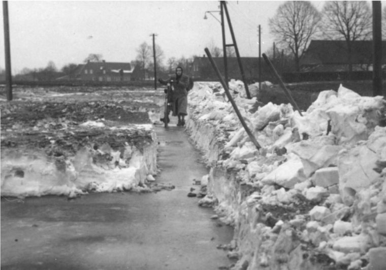 Een dame met fiets vindt een smalle doorgang in een halve meter dik pak sneeuw in Schoor, 1958. Foto collectie familie Jonkers.