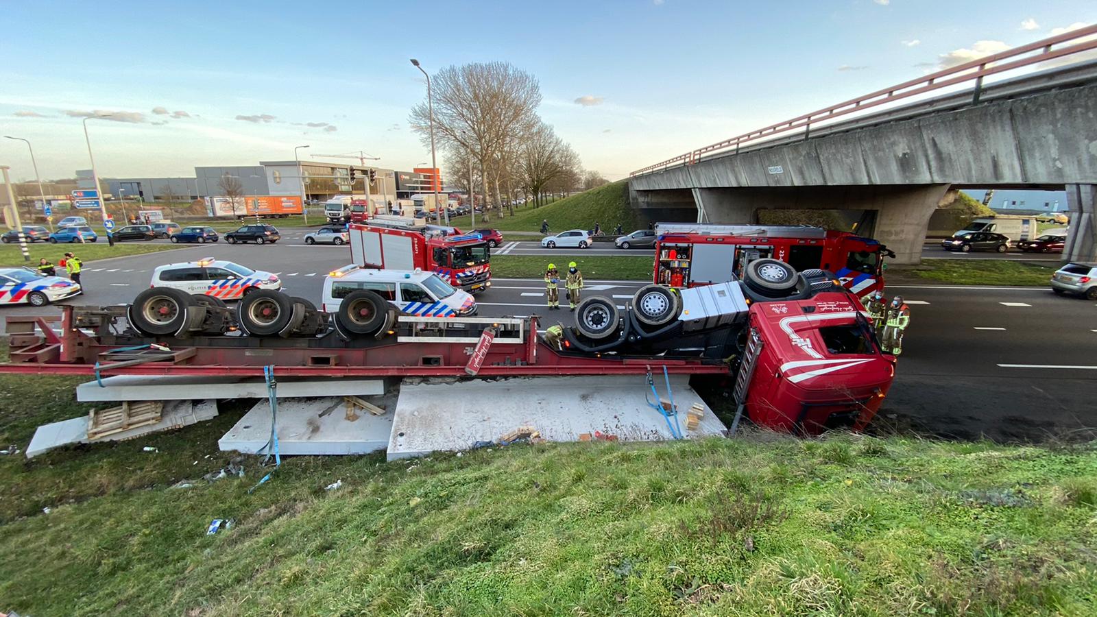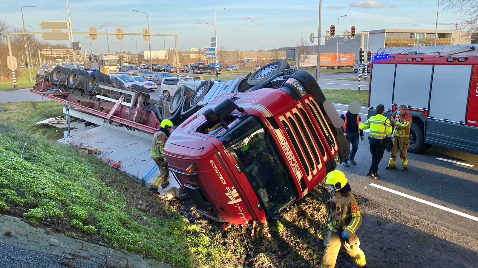Ravage op Randweg Zuid in Nederweert, vrachtwagen gekanteld