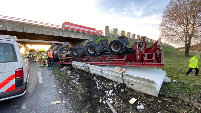 Dinsdagmiddag is een vrachtwagen met oplegger op zijn zijkant terechtgekomen. Het ongeval gebeurde op de Randweg West in Nederweert. De chauffeur en bijrijder konden op eigen kracht het voertuig verlaten.