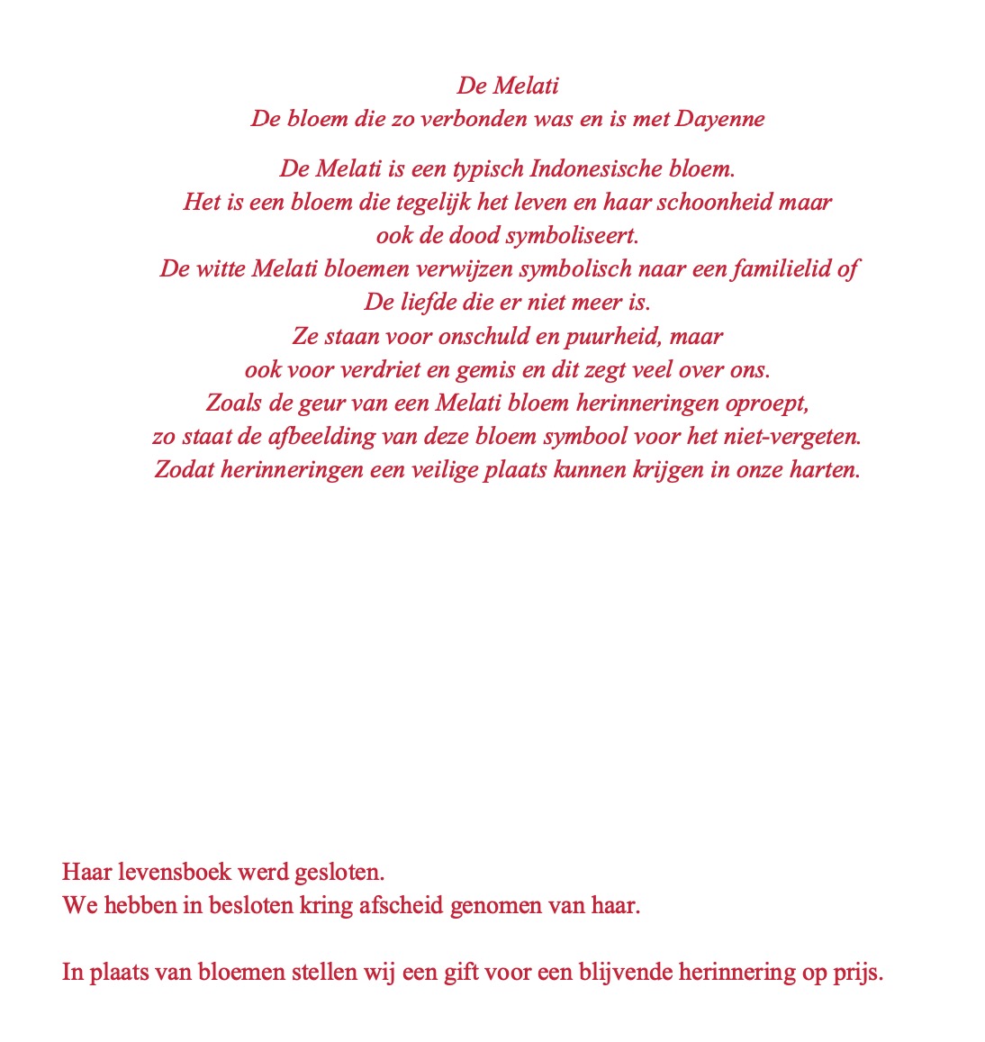 Het is ondertussen 19 dagen geleden dat Dayenne haar ogen heeft moeten sluiten.
