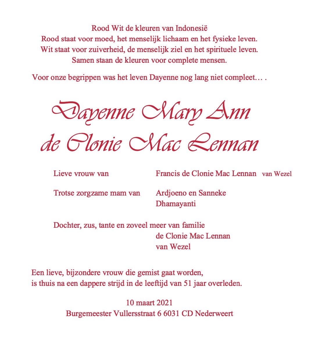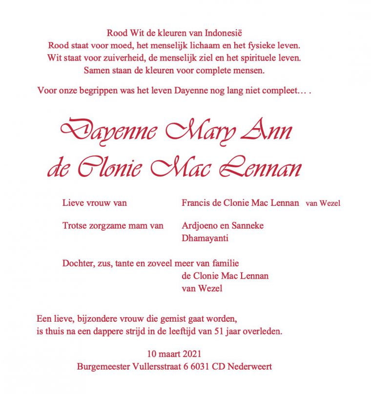 Overlijdensbericht: Dayenne Mary Ann de Clonie Mac Lennan †
